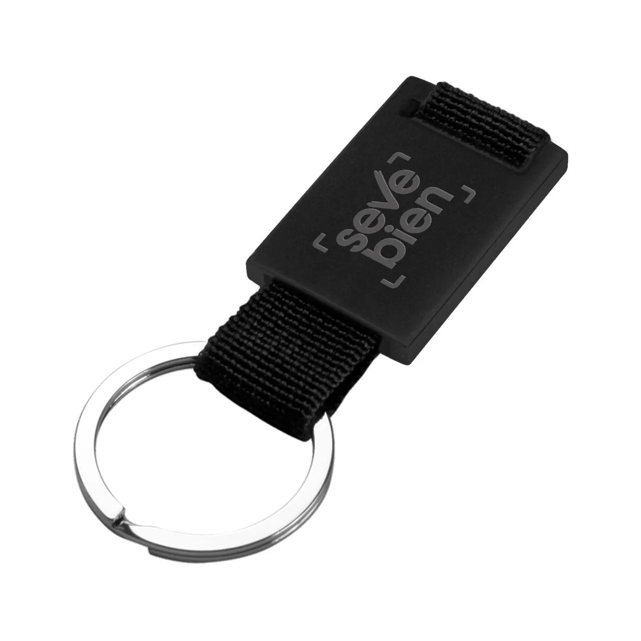Modernidad en tus manos.Llavero. Estructura metálica con aleación de zinc, terminación en negro mate. Correa de Polipropileno.Medidas: 6,2 x 2,7 x 0,4 cm.