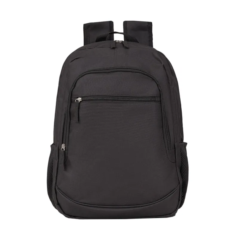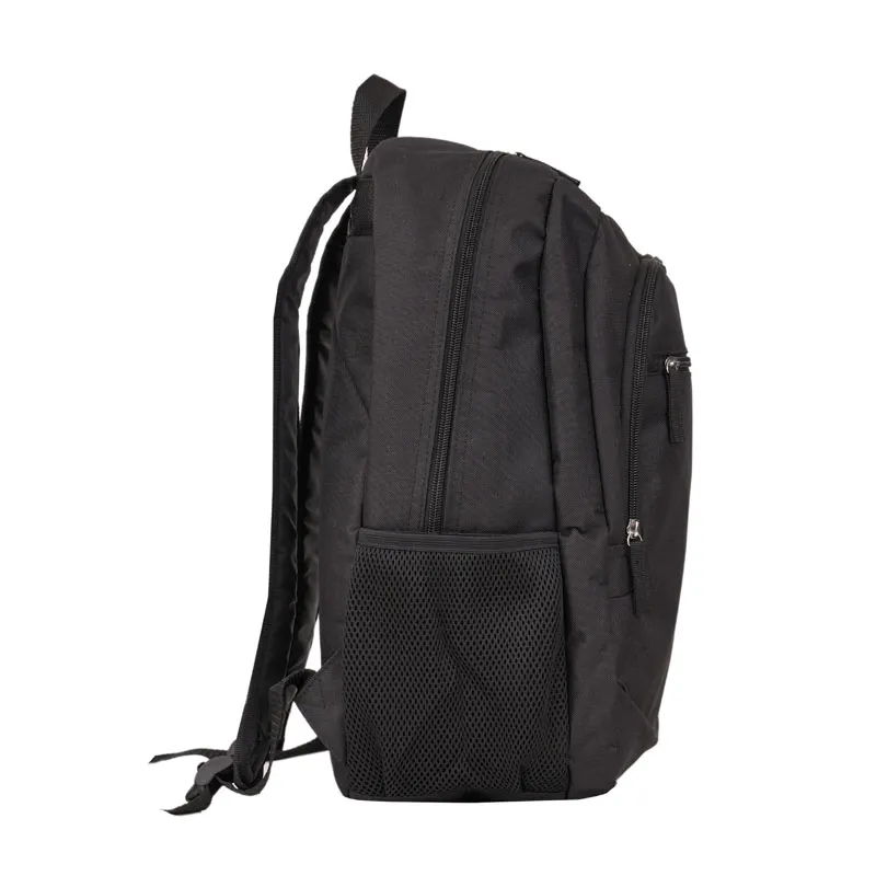 Mochila portanotebook, con respaldar acolchado, confeccionada en 100% polyester. Cuenta con dos bolsillos principales, un segundo bolsillo frontal, y laterales de red para transportar botellas o pequeños objetos.