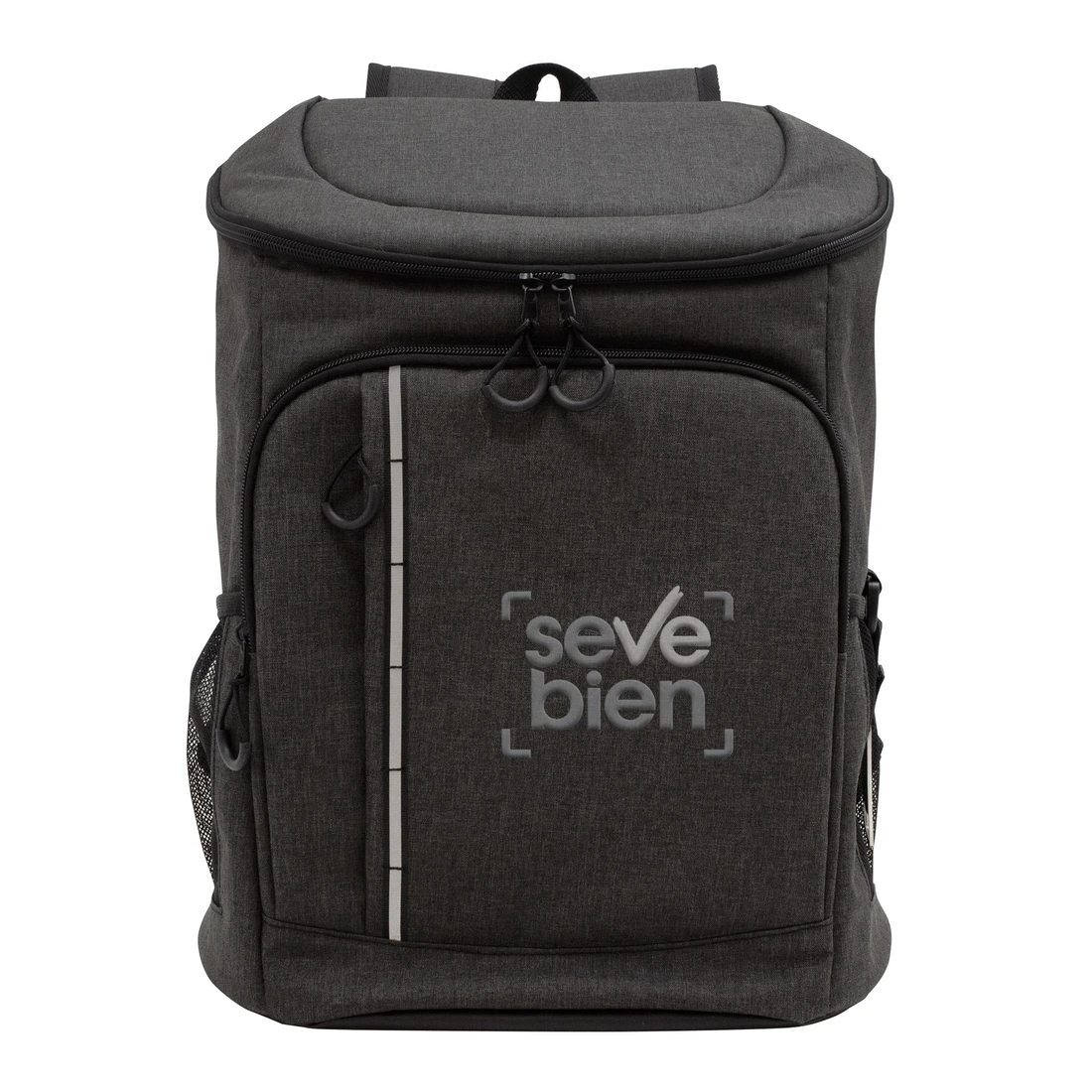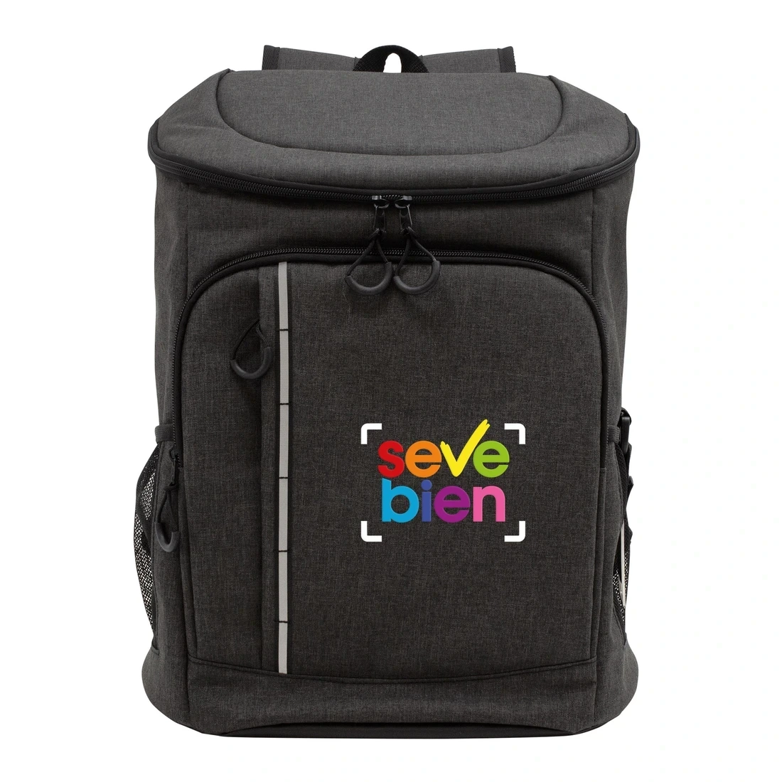 43 x 29 x 18 cm. Capacidad 18 litros aprox. Poliéster Wulong 300D + Interior forrado en PEVA color plata con relleno de espuma de PE. Mochila cooler. Compartimento principal con cierre en la parte superior. Compartimento frontal con cierre, bolsillo interno de red con cierre y bolsillo externo vertical con cierre y banda reflectante. Dos bolsillos laterales de red multipropósito. Incluye destapador de botellas de acero inoxidable (6,3 x 3,3 cm) extraíble. Correas regulables acolchadas. Cierres metálicos. Tiradores de cierre plásticos en forma de U de color negro.