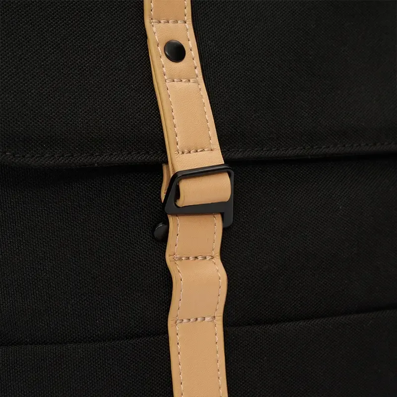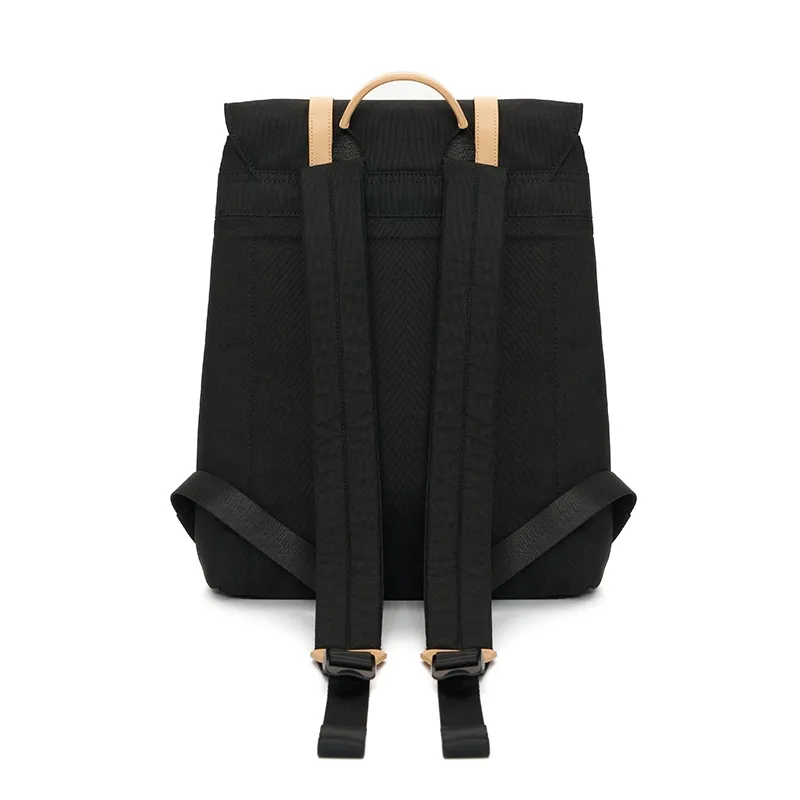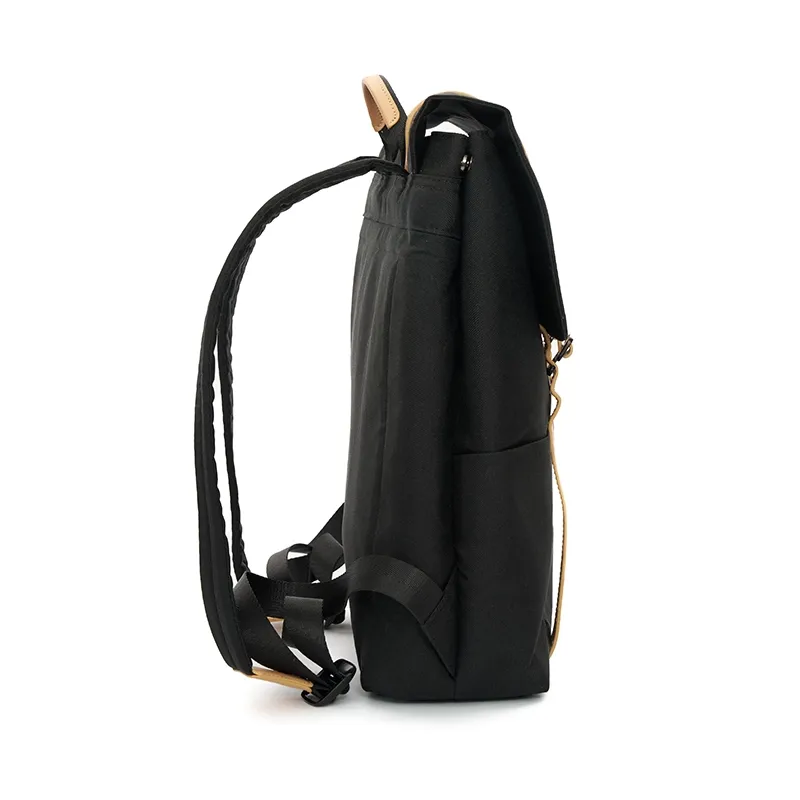 Mochila tipo urbana con solapa y broches metálicos, confeccionada en poliéster reciclado 600D. Cuenta con compartimiento principal bajo solapa, broches metálicos al frente, tiras ajustables y bolsillo interior. Incluye manija superior, diseño estructurado y costuras reforzadas que aportan durabilidad.