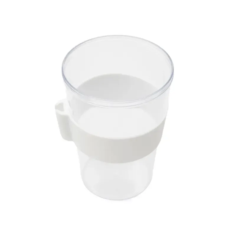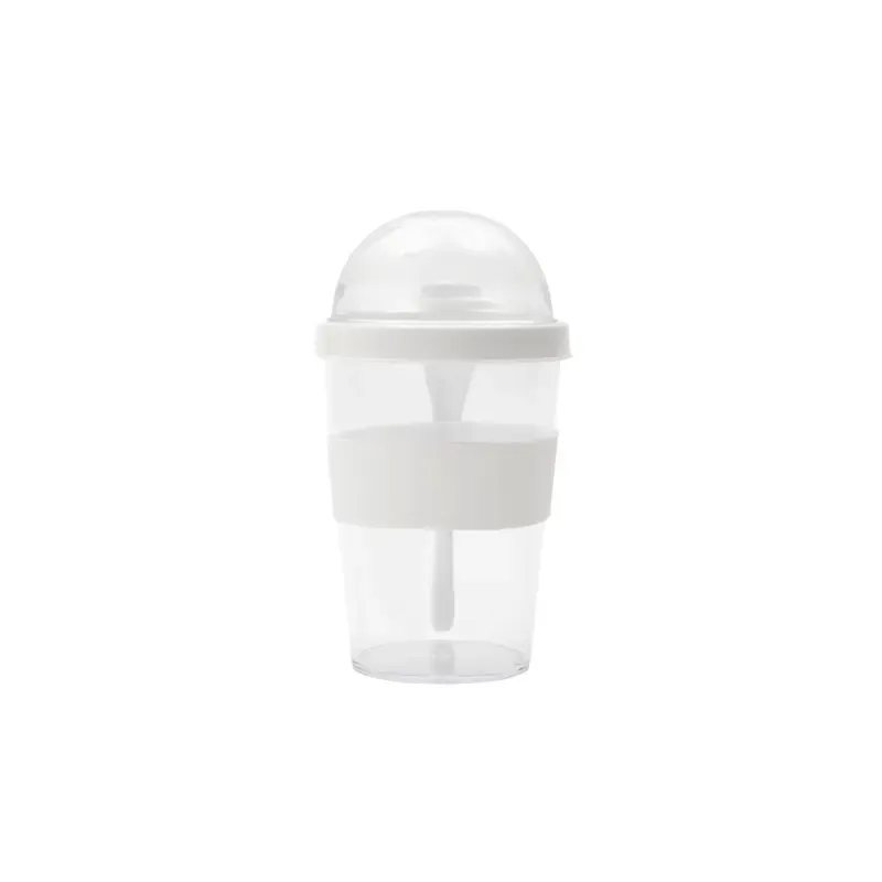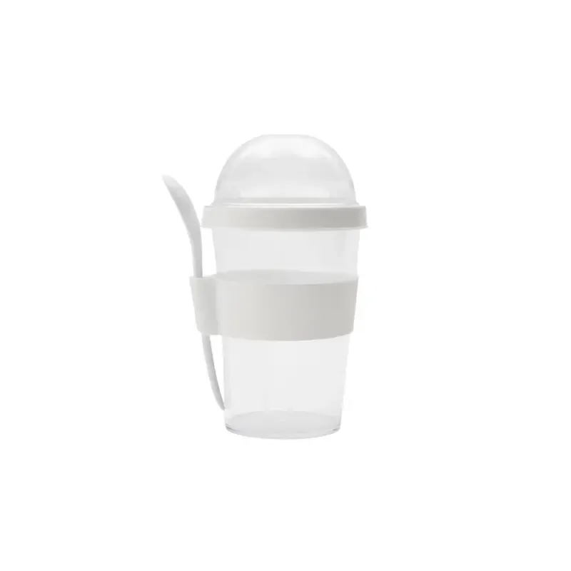 Jarro con compartimento superior y cuchara, fabricado en plástico PS con tapa de polipropileno y grip de silicona. Cuenta con domo transparente para cereales o toppings y cuchara incluida. Es ideal para desayunos saludables y prácticos fuera de casa, en la oficina o en viajes.
