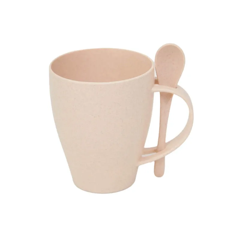 Mug de PP y Wheat Straw, pasta de tallo de trigo, un material sustentable que reduce el consumo de plásticos vírgenes. Capacidad de 400ml. Cuenta con orificio en el mango para colocar la cucharita.