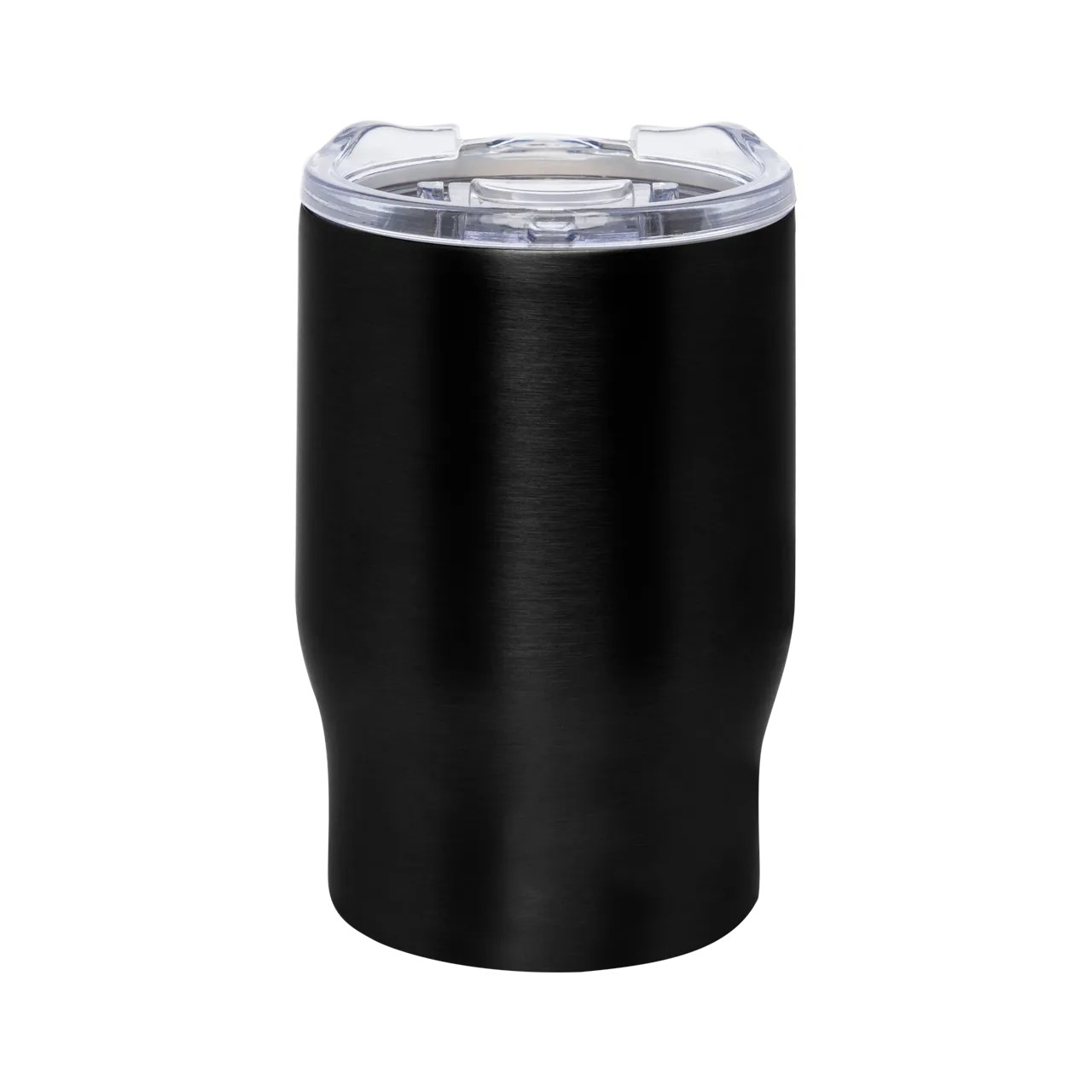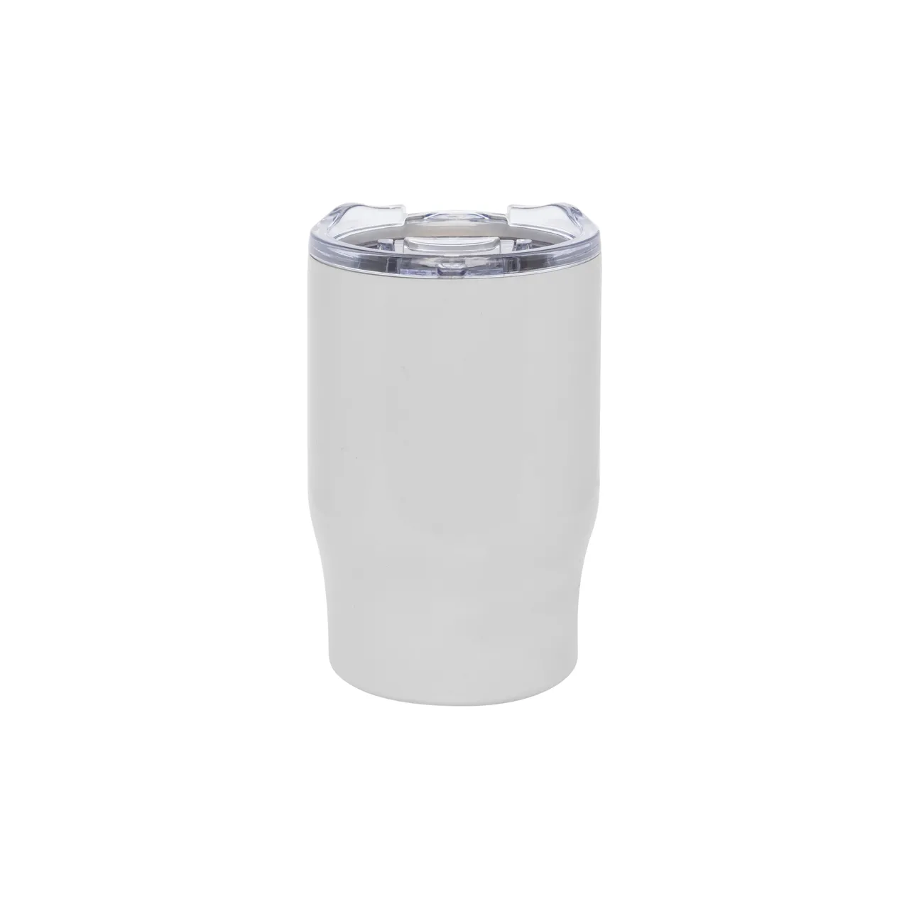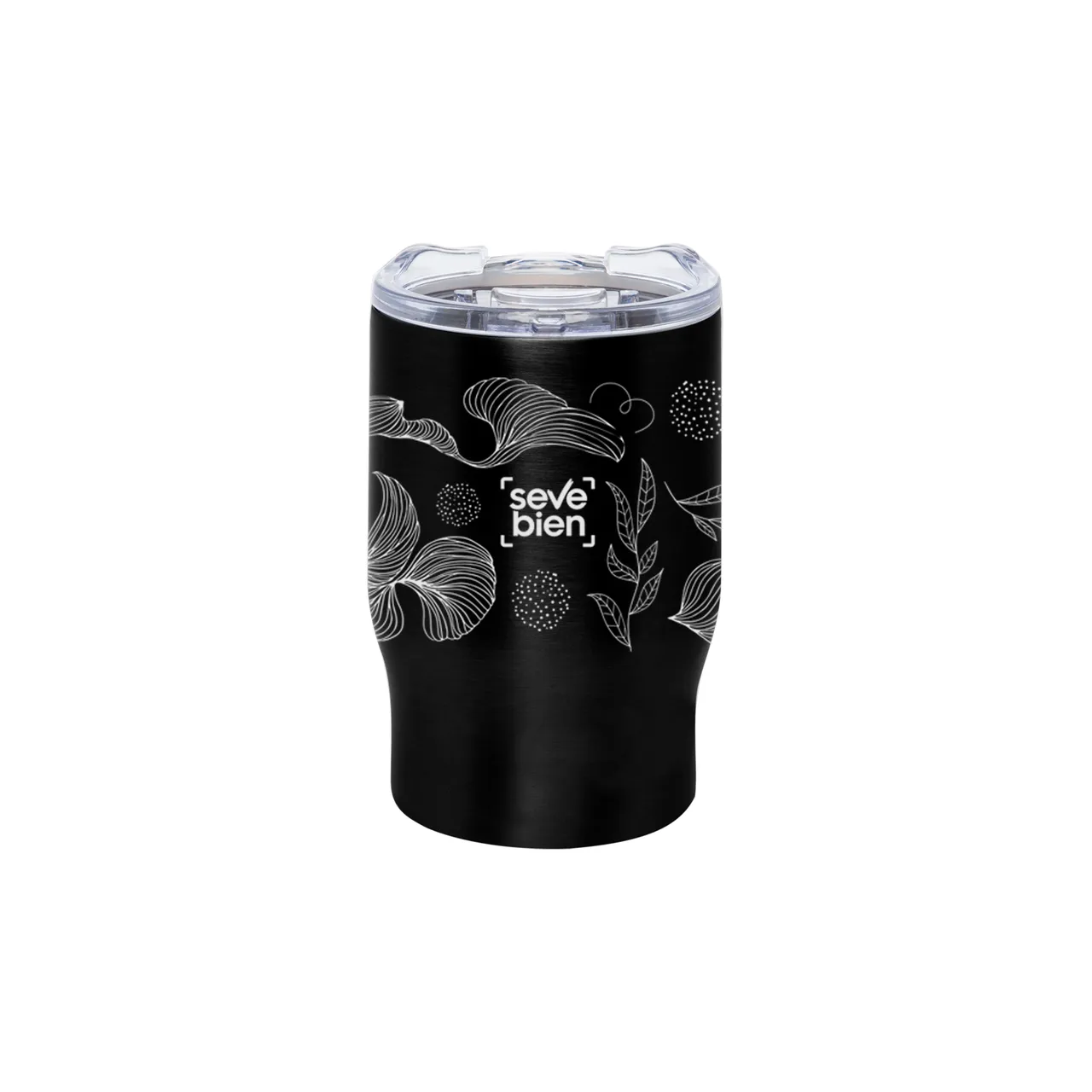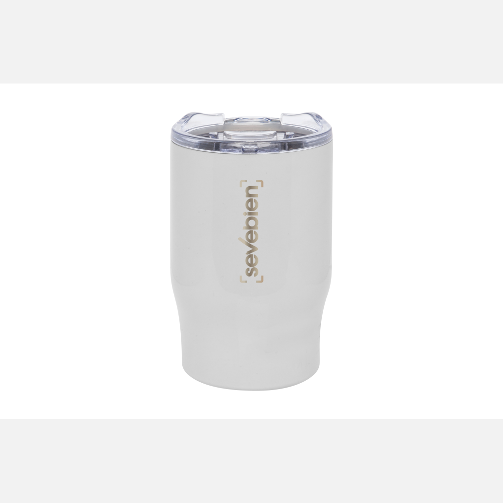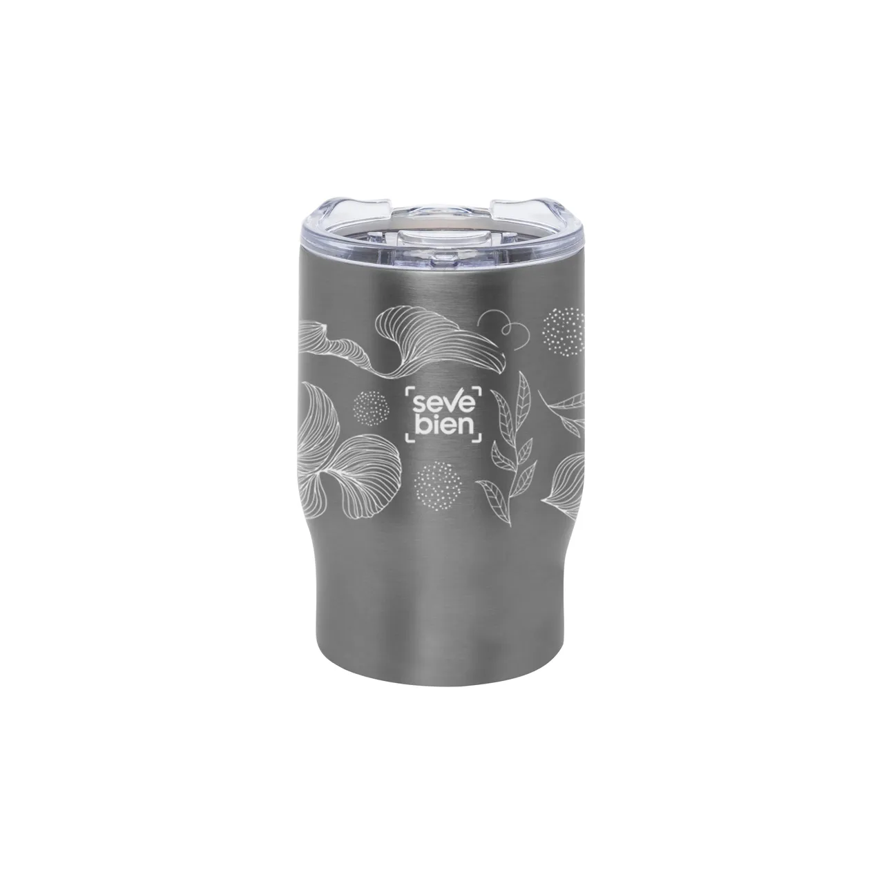 Ø 8,5 x 13,3 cm. Capacidad 350 ml. Acero inoxidable. Mug doble pared. Interior de acero 304 y exterior de acero 201. Tapa plástica transparente a presión con anillo de silicona. Mantienen las bebidas frías y calientes por más tiempo. No utilizar con bebidas gaseosas. Presentación en caja de regalo.