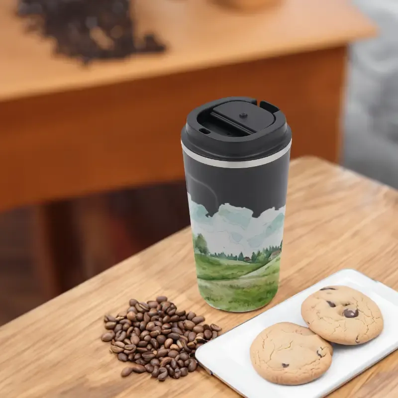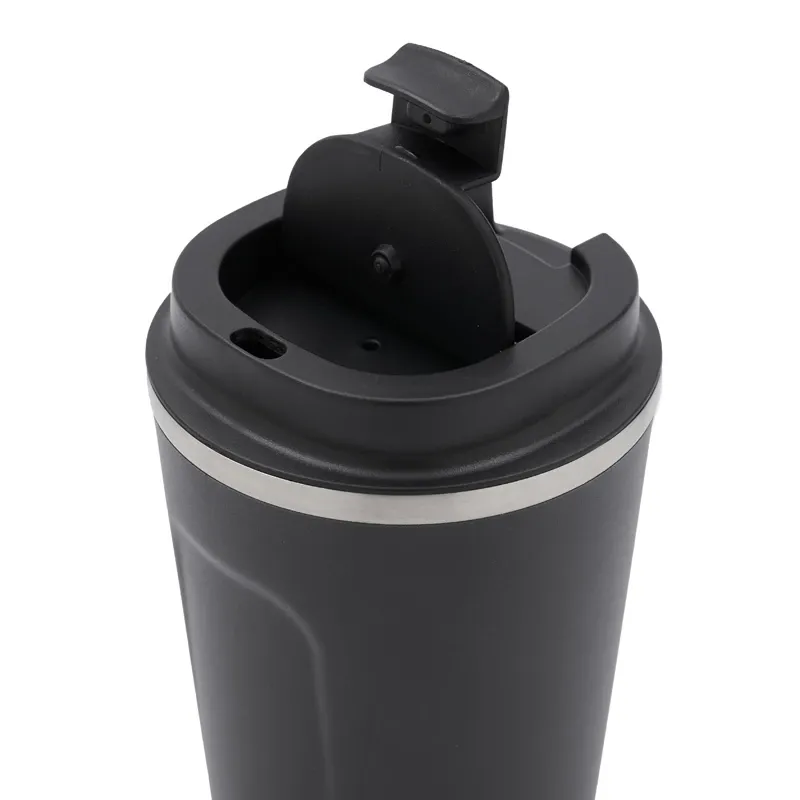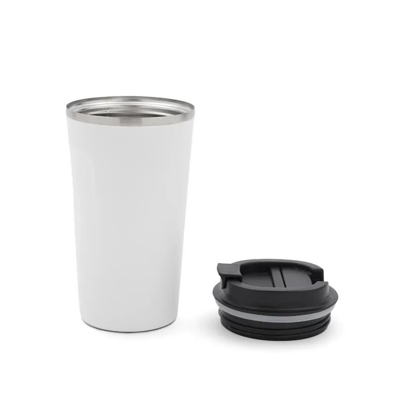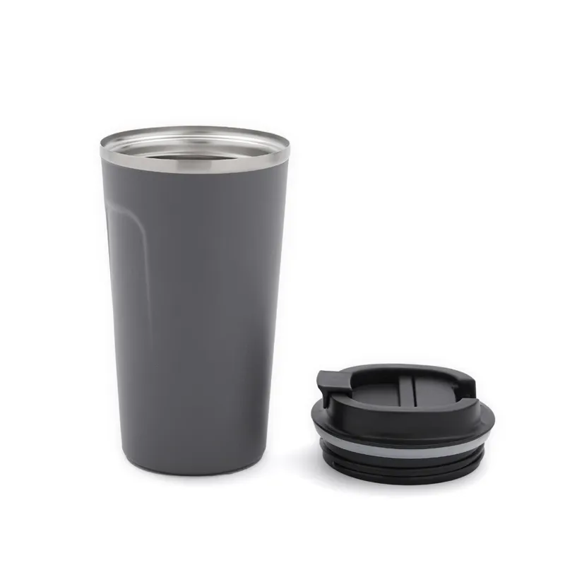 Mug construido en doble pared de acero inoxidable, esmaltado de color en su exterior y tapa de polipropileno antiderrame. Reutilizable. Dimensiones: 17 x 9 cm | 7 cm de base. Ideal para café, té, bebidas frías o calientes. Capacidad:500ml. Incluye Gift Box confeccionada en cartulina Kraft.
