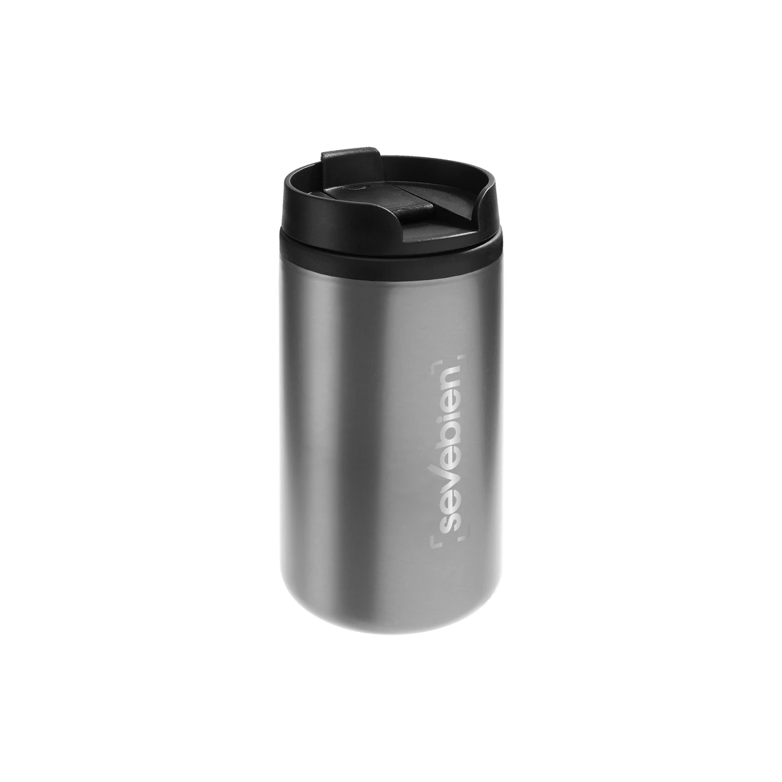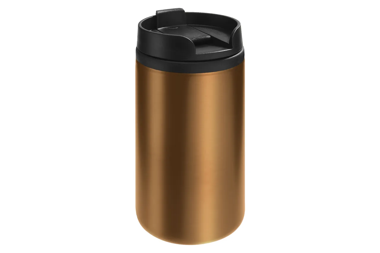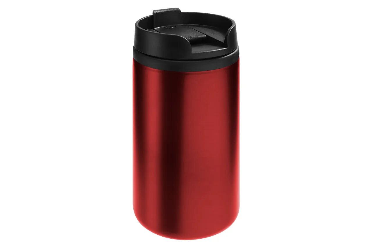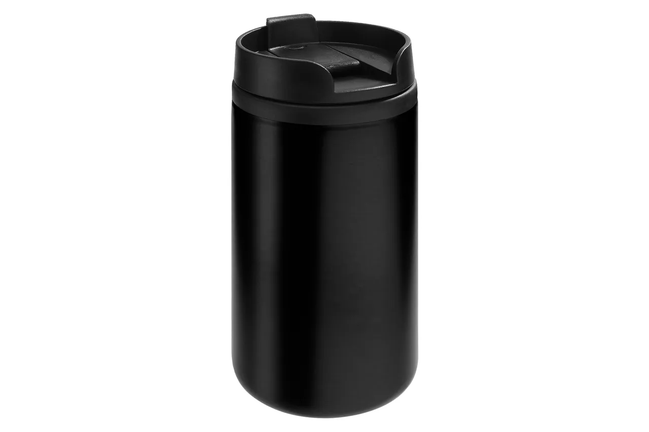 Ø 7 x 14 cm. Capacidad 290 ml. Acero inoxidable y plástico. Mug doble pared, interior de plástico y exterior de acero inoxidable. Tapa a rosca plástica color negro con cierre a presión antiderrame. Base antideslizante. Presentación en caja de regalo.