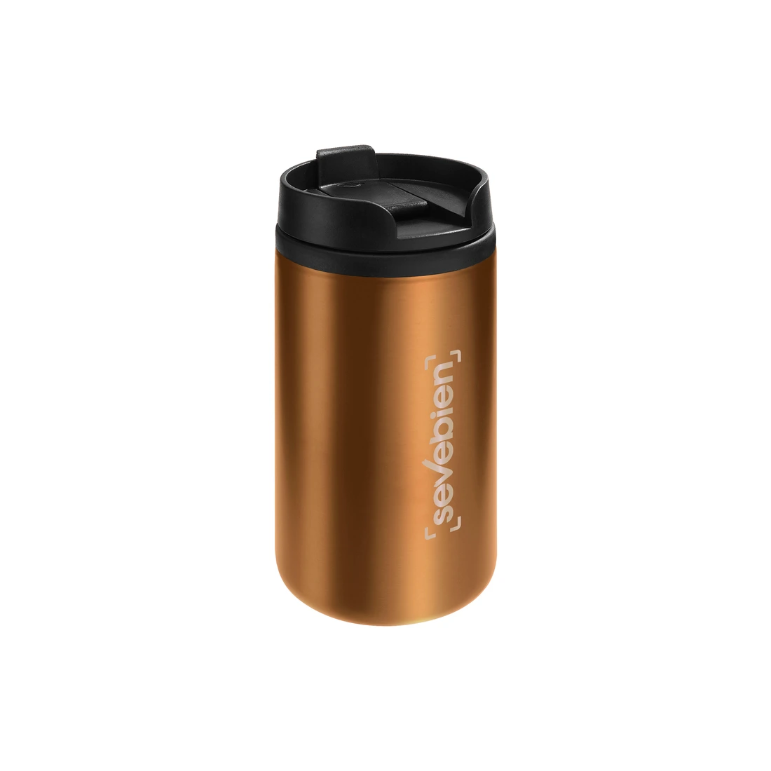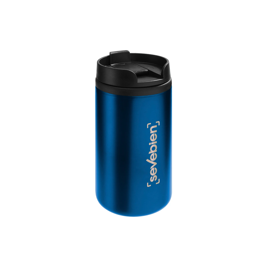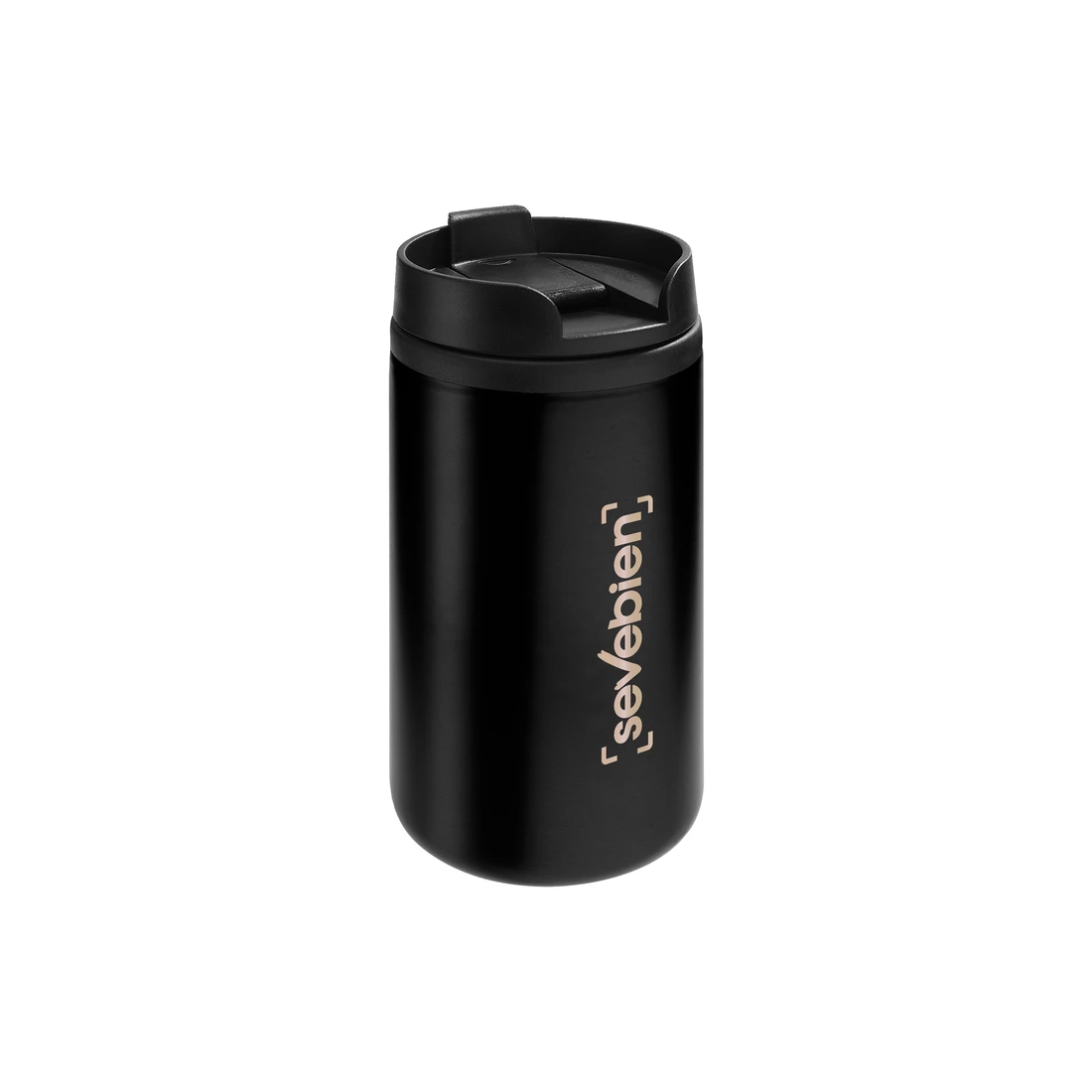 Ø 7 x 14 cm. Capacidad 290 ml. Acero inoxidable y plástico. Mug doble pared, interior de plástico y exterior de acero inoxidable. Tapa a rosca plástica color negro con cierre a presión antiderrame. Base antideslizante. Presentación en caja de regalo.