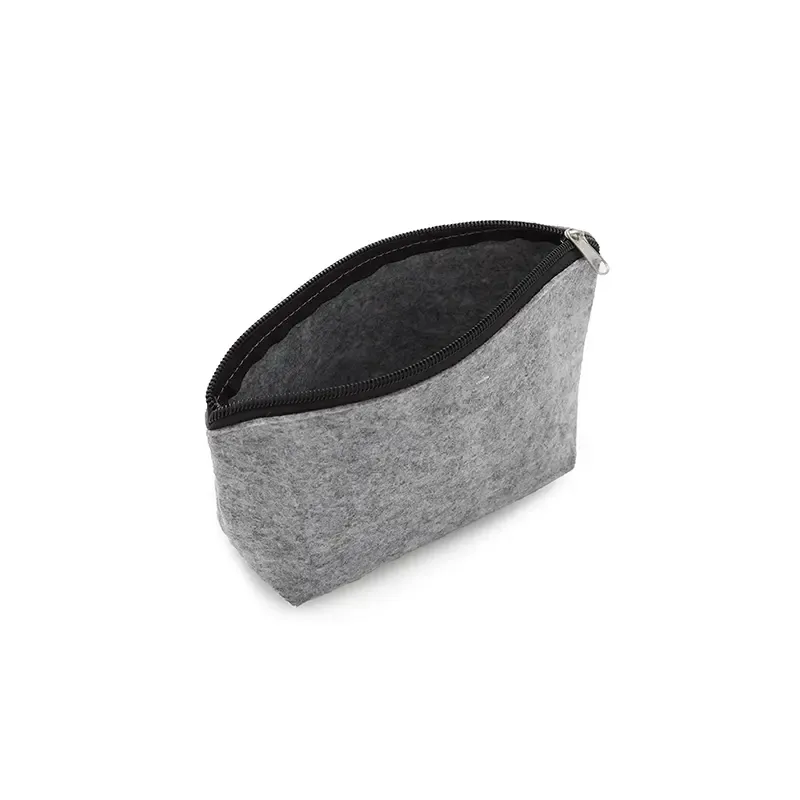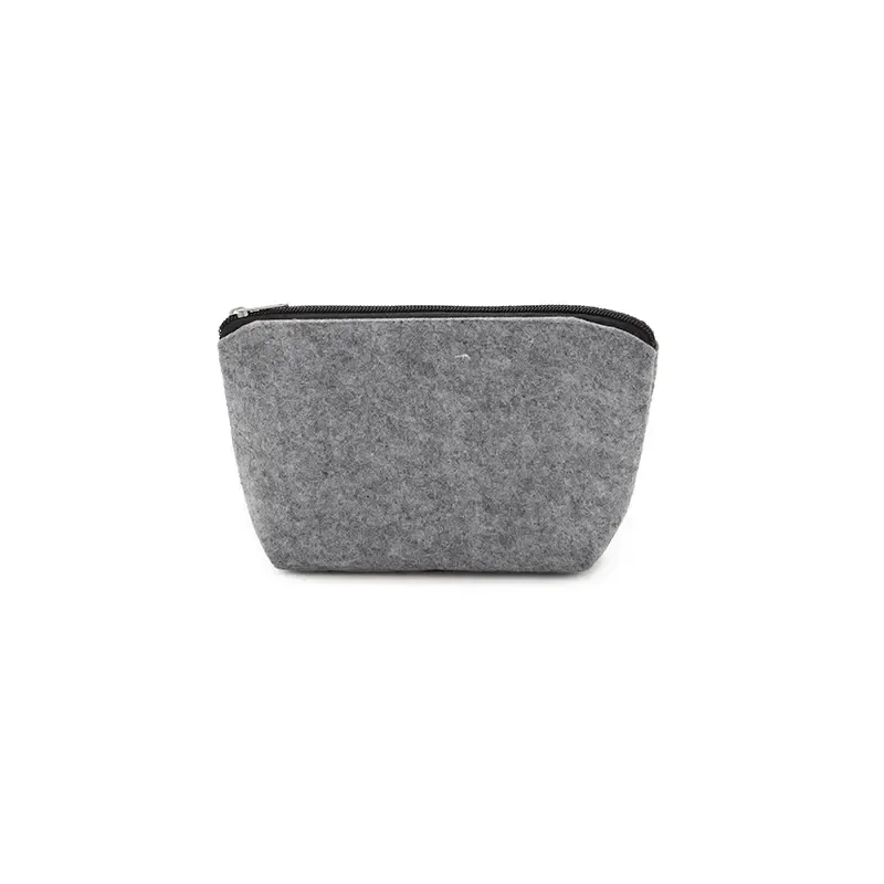 Neceser de fieltro RPET en color gris, confeccionada a partir de botellas recicladas. Dimensiones: 21 x 12 x 6,5 cm. Ideal para transportar los elementos de cuidado personal en viajes y bolsos de deporte. ReUseMe