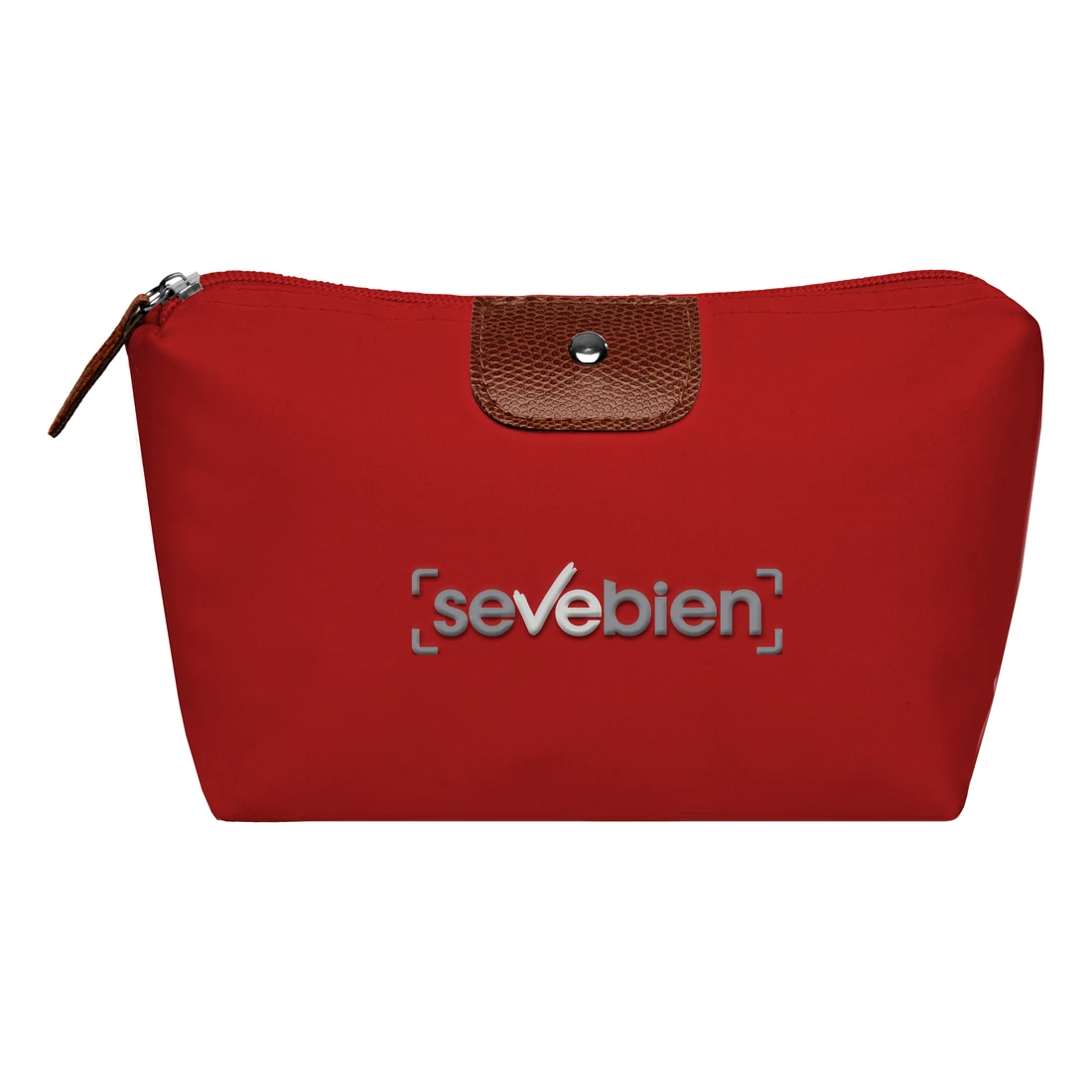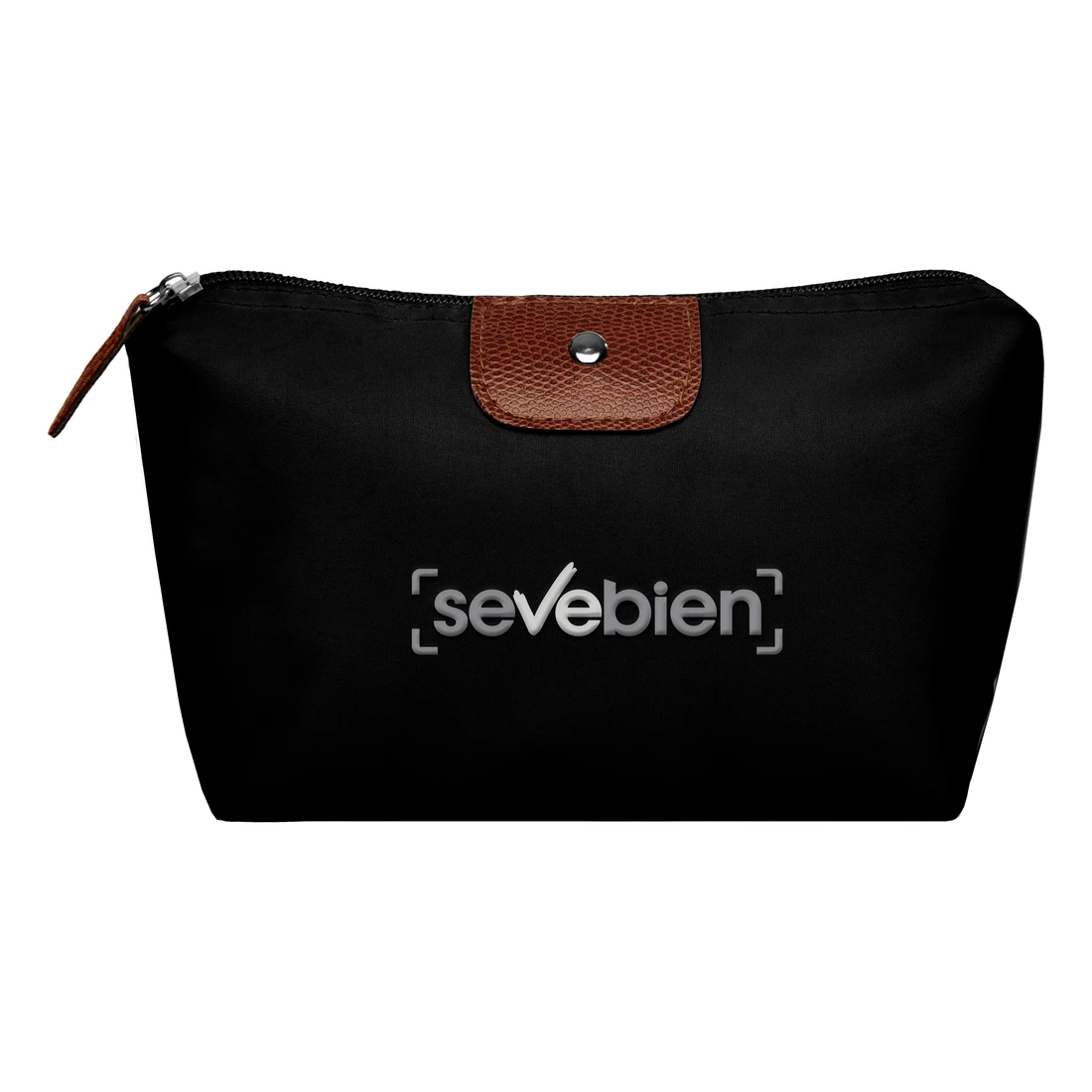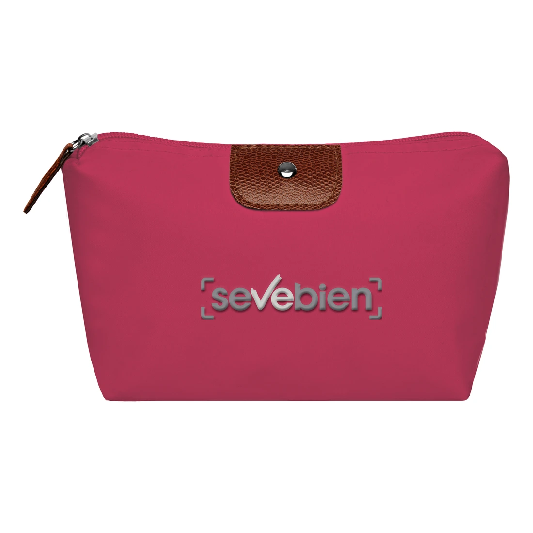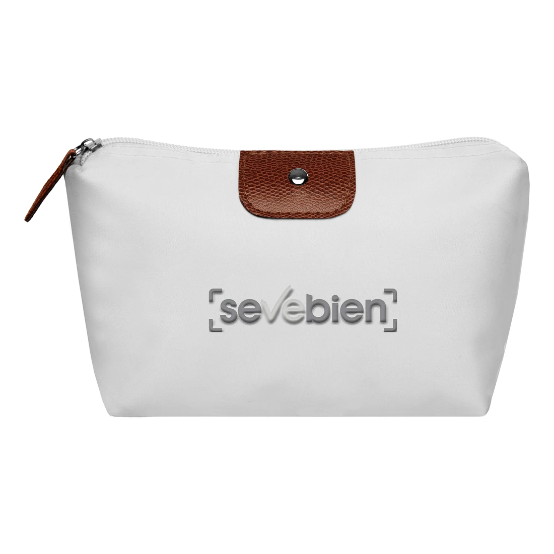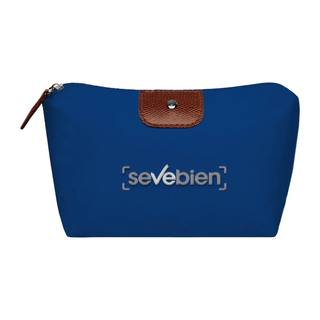 22 x 13 x 5,5 cm. Polyester. Necessaire con detalles en símil cuero y un botón metálico en el frente. Interior con forro. Tiradores de cierre de símil cuero.