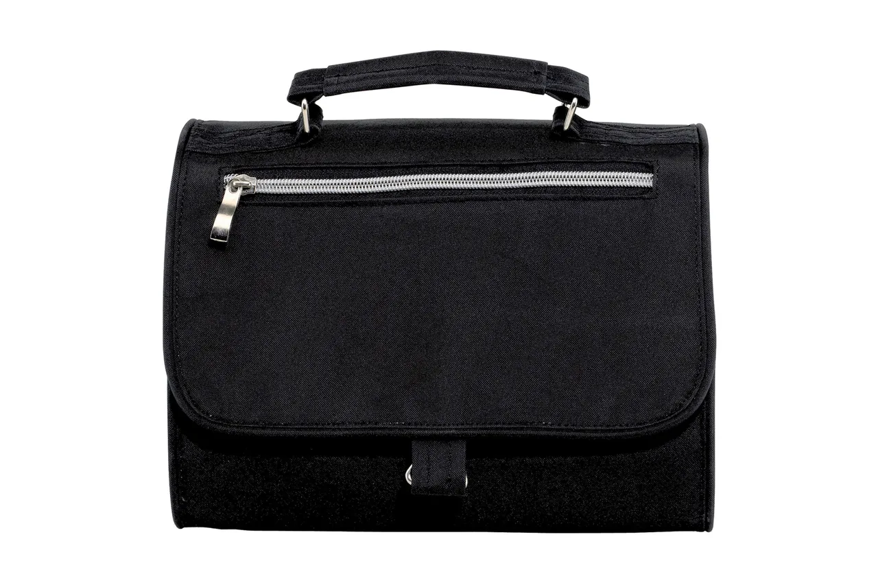 25 x 8 x 18 cm cerrado / 25 x 59 cm abierto. Polyester 600D. Colgante. Con cierre, 3 compartimentos interiores, 1 compartimento exterior en la parte frontal con cierre.