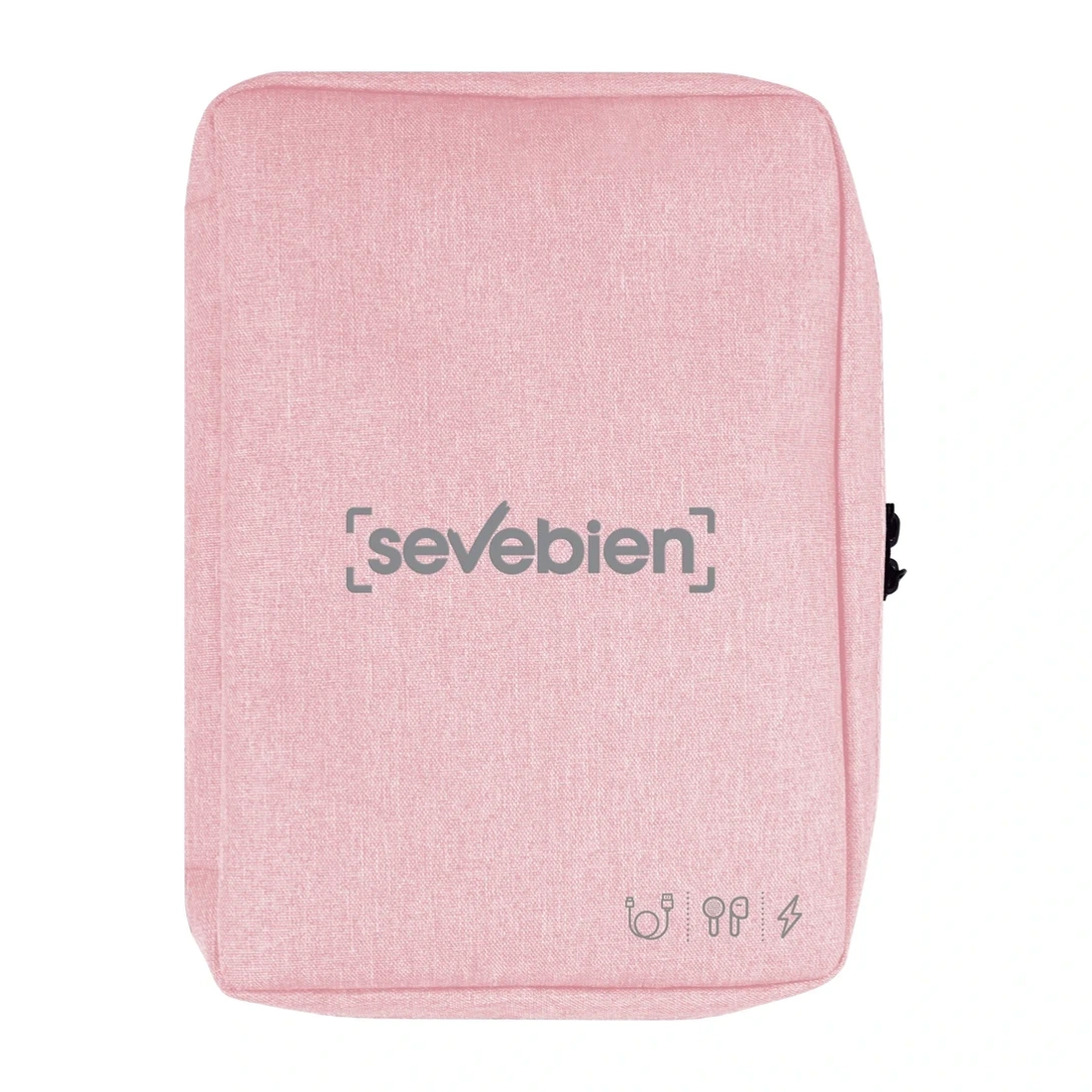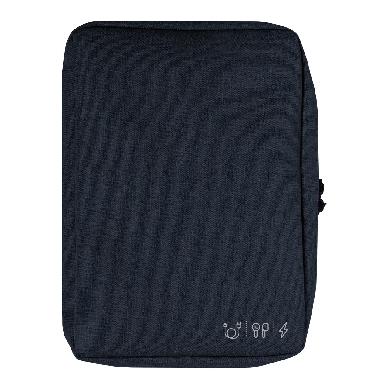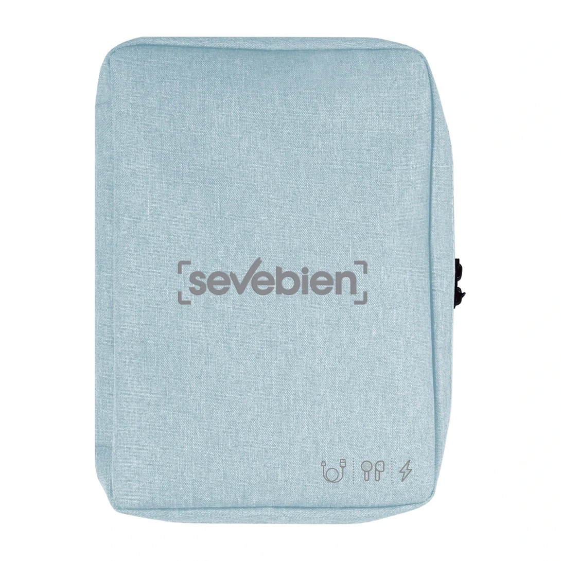 19 x 26 x 5 cm. Poliéster. Organizador para cables y accesorios. Cuenta con dos bolsillos de red con cierre. 4 elásticos que permiten arrollar y guardar los cables, 1 elástico porta bolígrafo y 2 elásticos amplios. NO INCLUYE ACCESORIOS.