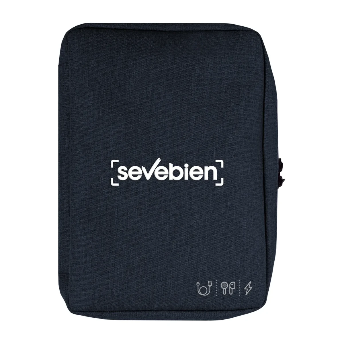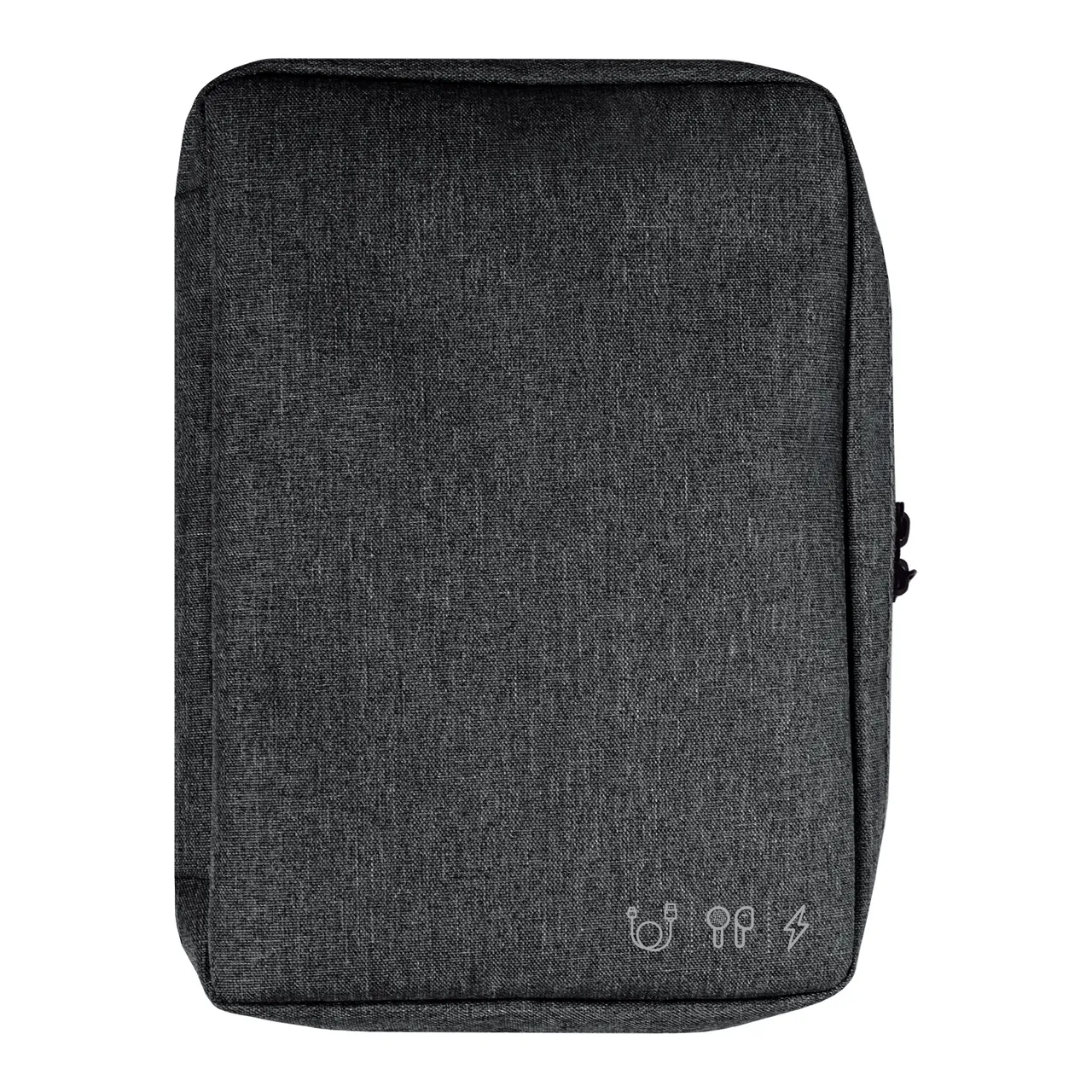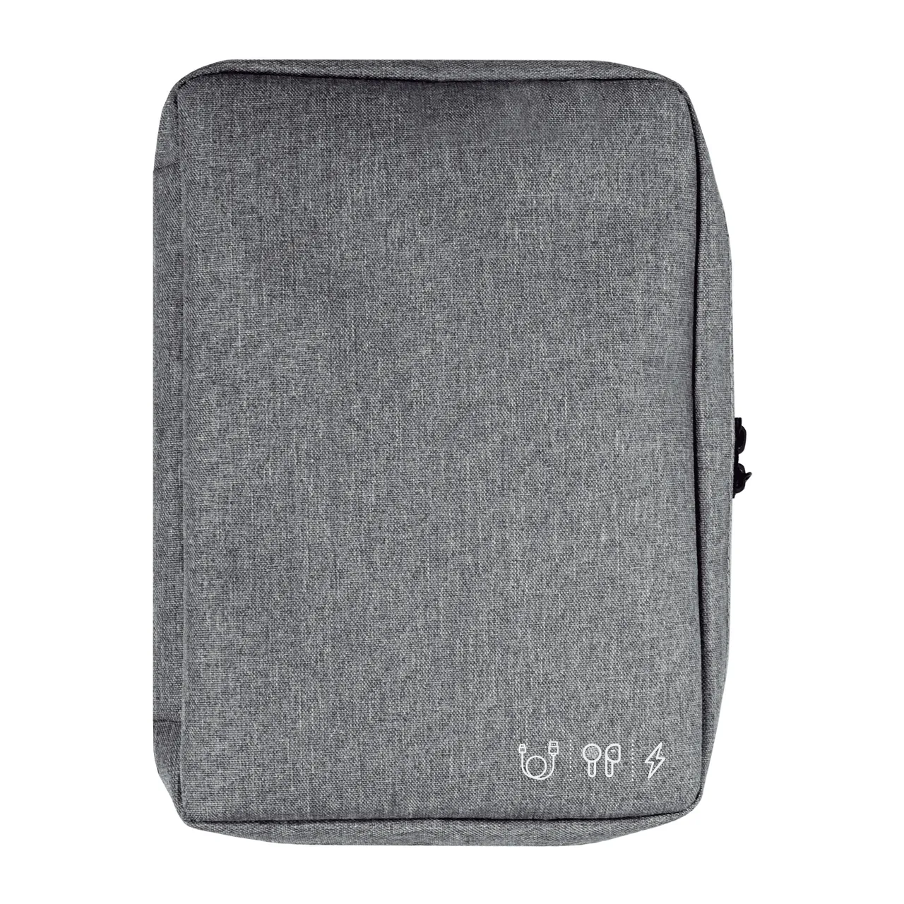 19 x 26 x 5 cm. Poliéster. Organizador para cables y accesorios. Cuenta con dos bolsillos de red con cierre. 4 elásticos que permiten arrollar y guardar los cables, 1 elástico porta bolígrafo y 2 elásticos amplios. NO INCLUYE ACCESORIOS.