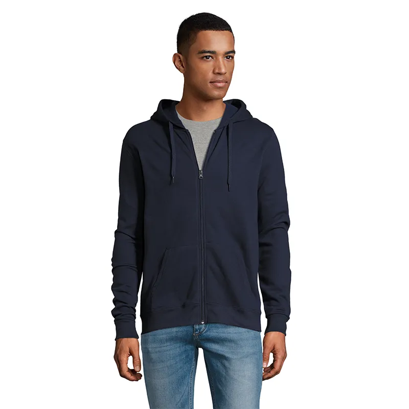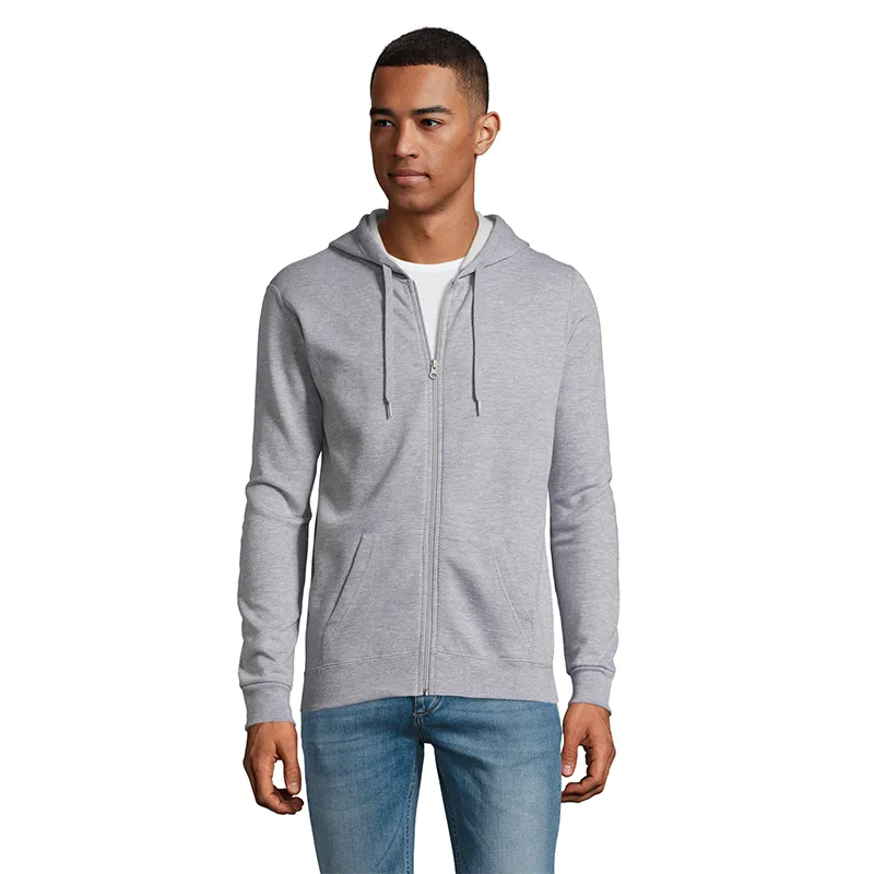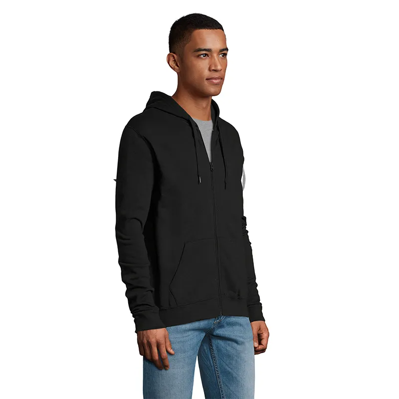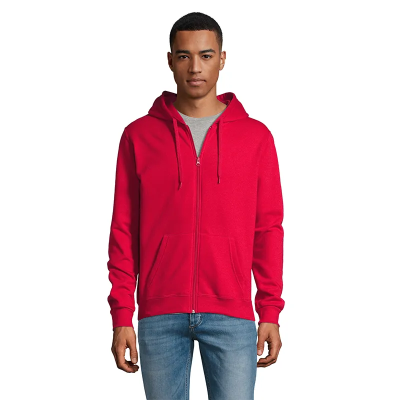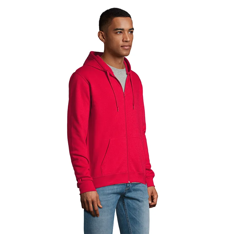 Polerón de frisa 50% algodón y 50% poliéster de 260g con cierre y capucha unisex.