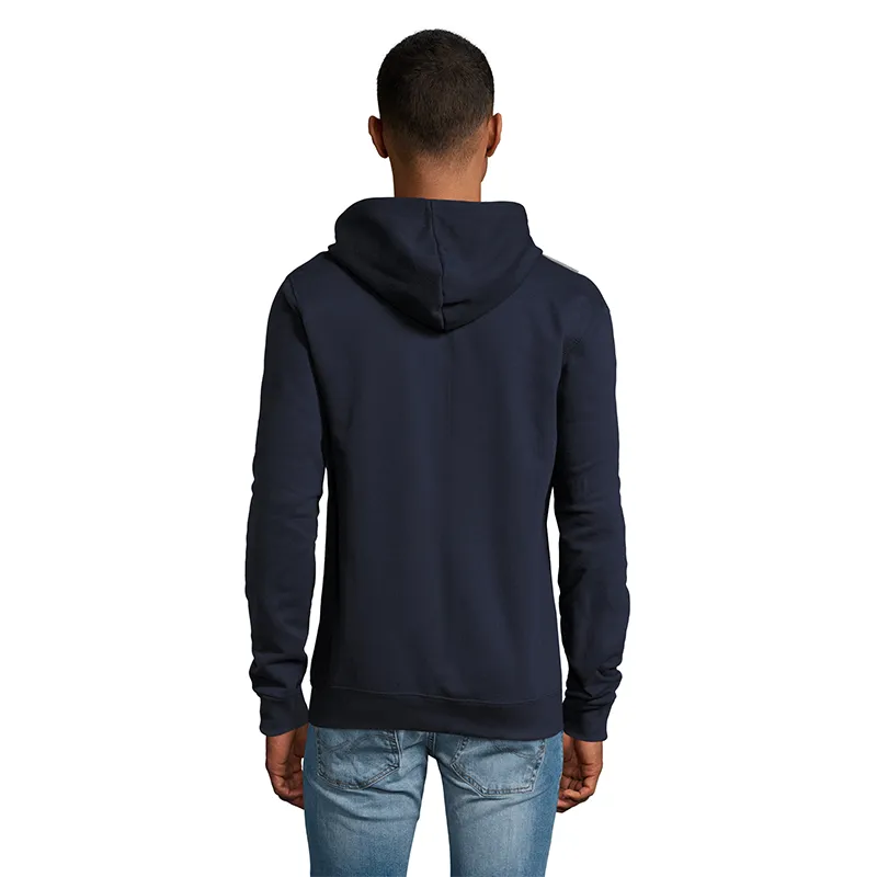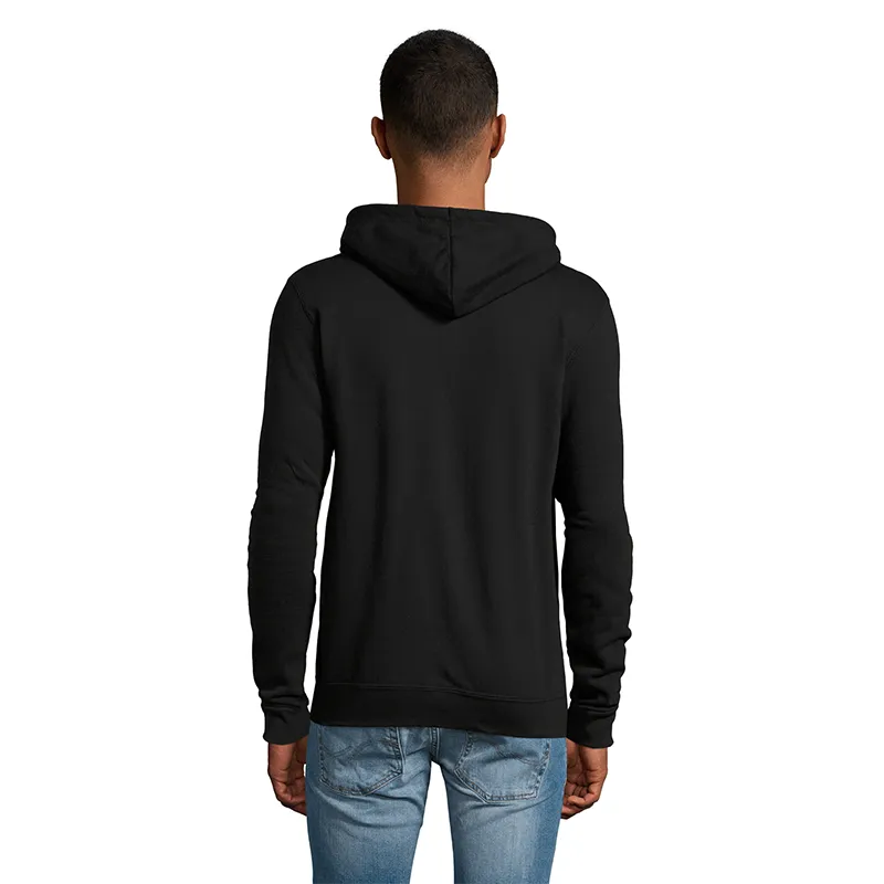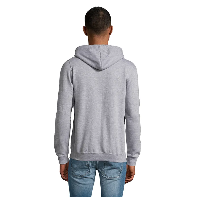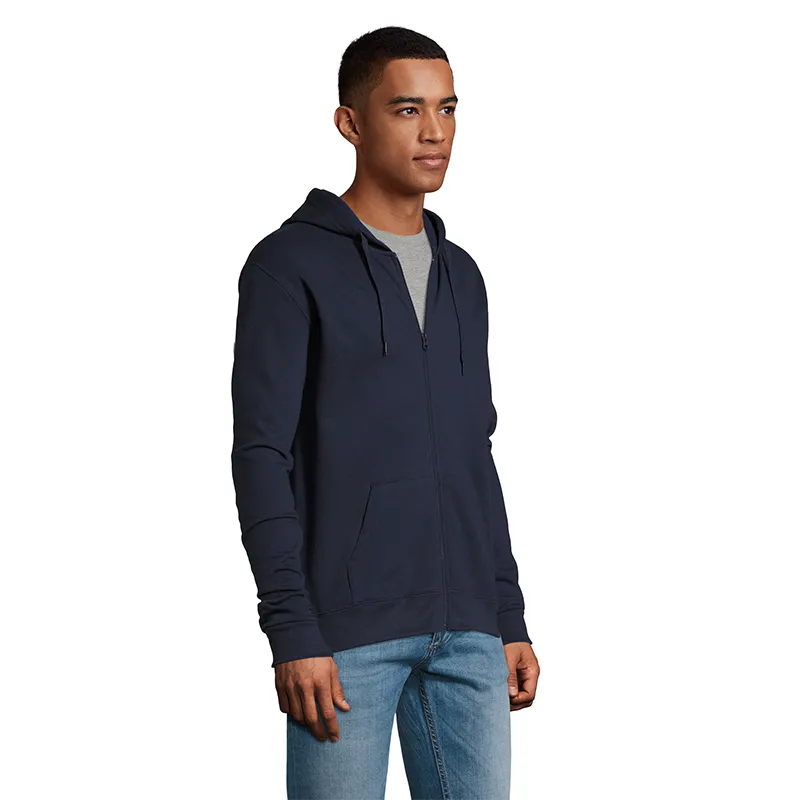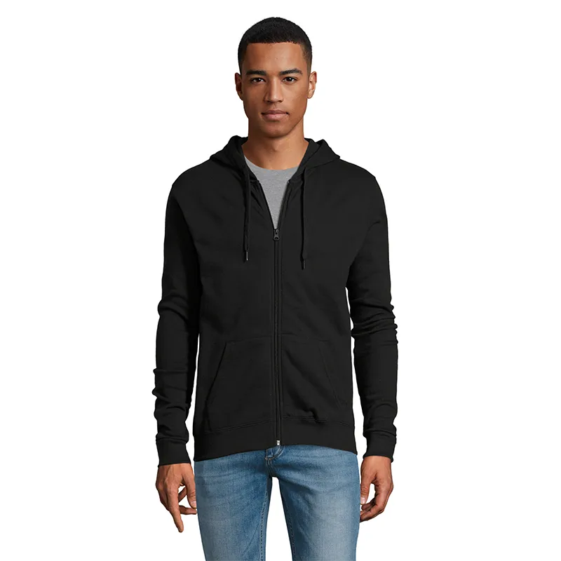 Polerón de frisa 50% algodón y 50% poliéster de 260g con cierre y capucha unisex.