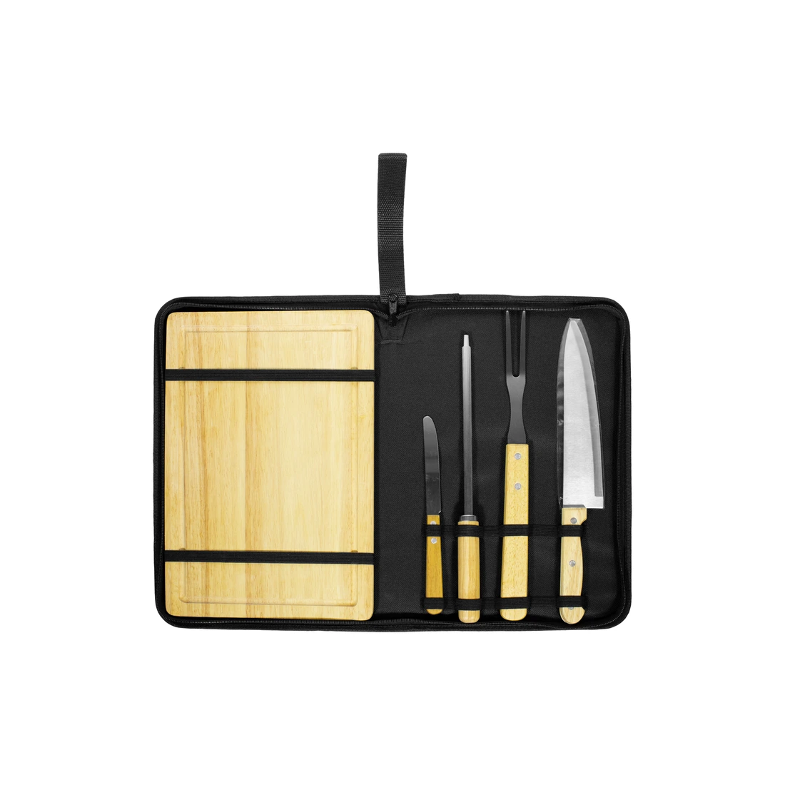 23 x 35,5 x 4,2 cm. Poliéster 300D, bambú y acero inoxidable. Set de asado de 5 piezas: Tabla de bambú 32,5 x 21,5 x 1,1 cm. Tenedor asador, cuchilla, cuchillo y chaira para afilar, todos con mango de madera barnizados. Presentación en caja de regalo.