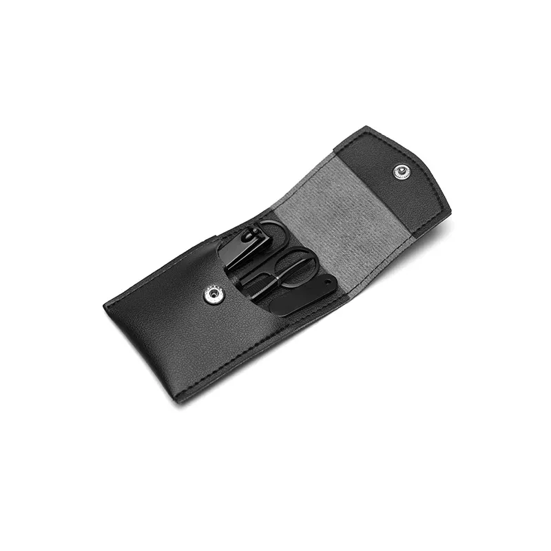 Set de belleza, incluye tijera, cortauñas, pinza de depilar y lima, todos en acero inoxidable color negro. El estuche está confeccionado en cuero PU negro.