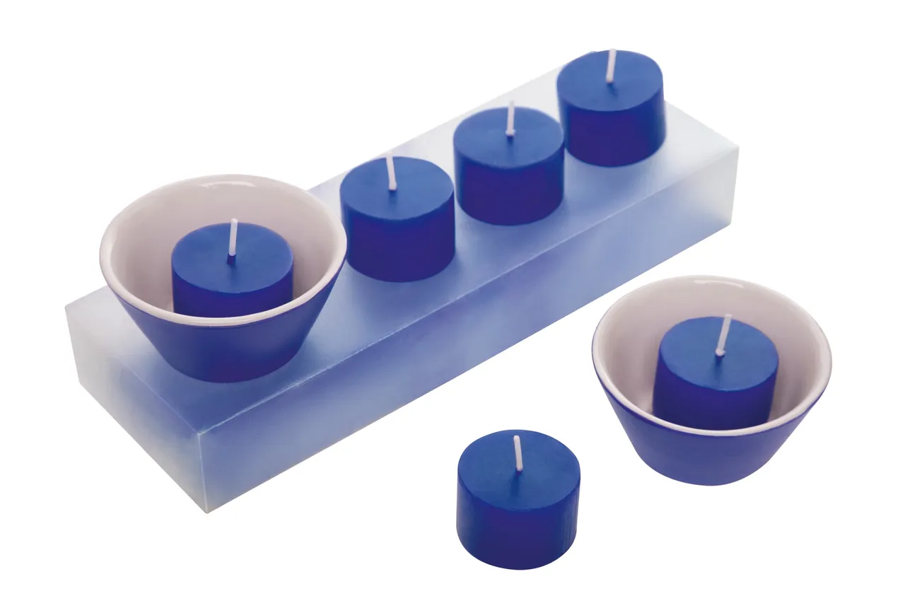 21,8 x 7,5 x 3,5 cm. Set de 6 velas de color y 2 portavelas de cerámica. Presentación en caja transparente de regalo.