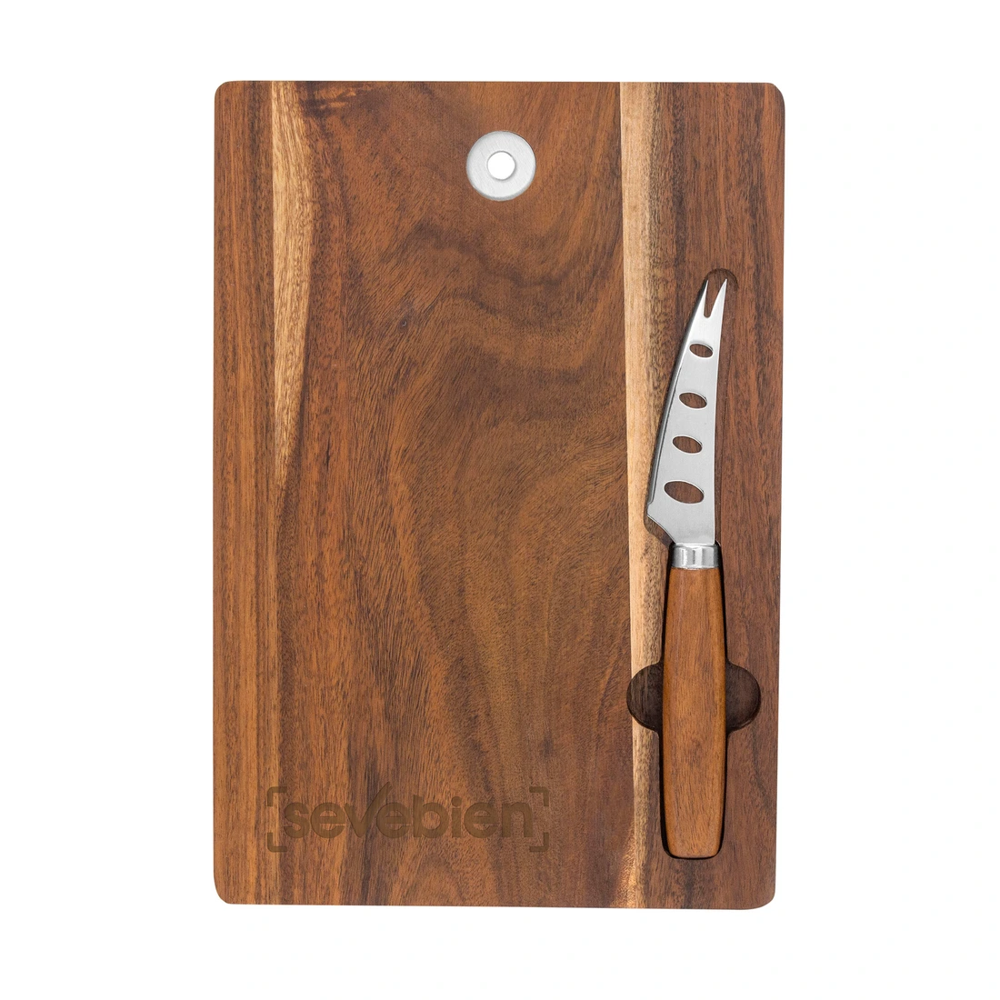 24,5 x 17,2 x 1,5 cm. Madera y acero inoxidable. Tabla para quesos. Tabla de madera de acacia con imán para fijar el cuchillo y anillo de acero inoxidable para colgar. Cuchillo con agujeros ideal para quesos blandos a semiduros, de 17,2 cm., hoja de acero inoxidable 420 y mango de madera de acacia. Presentación en caja de regalo kraft.