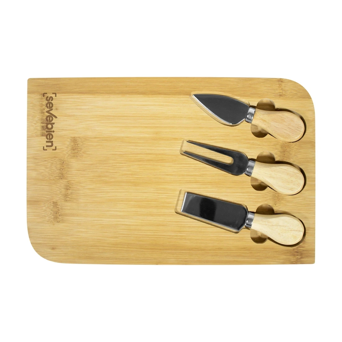 29,8 x 18,7 x 1,2 cm. Bambú y Acero inoxidable . Tabla de bambú con set de 3 utensilios de acero inoxidable 210 con mango de madera: 2 cuchillos y 1 tenedor. Tabla para cortar y presentar diferentes quesos acompañada de un buen vino tinto en tus próximas reuniones. Presentación en caja de regalo.