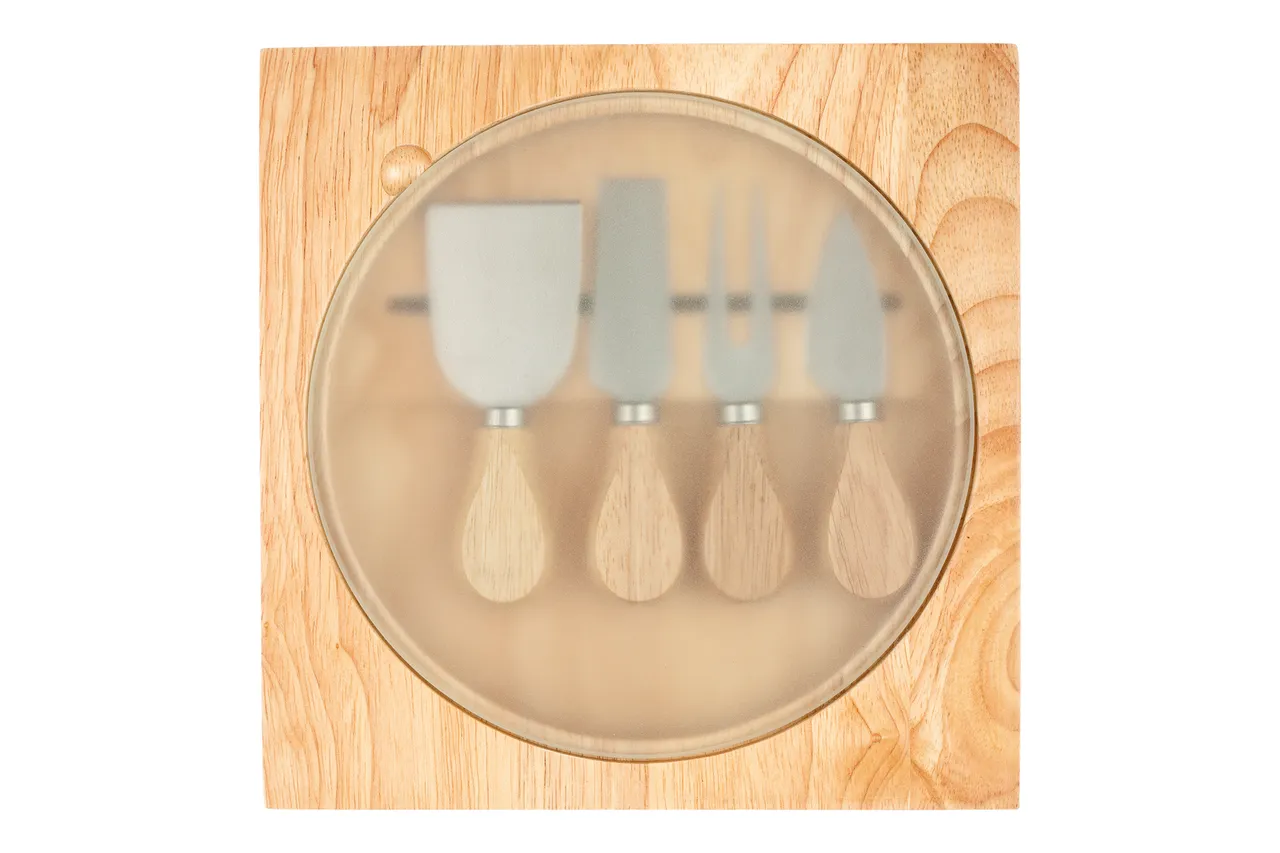 23 x 23 x 2,5 cm. Madera. Tabla para quesos. En la parte interna contiene imán que sostiene 4 utensilios de acero inoxidable y mango de madera. Tabla circular de vidrio templado Ø 20 cm. Presentación en caja de regalo.
