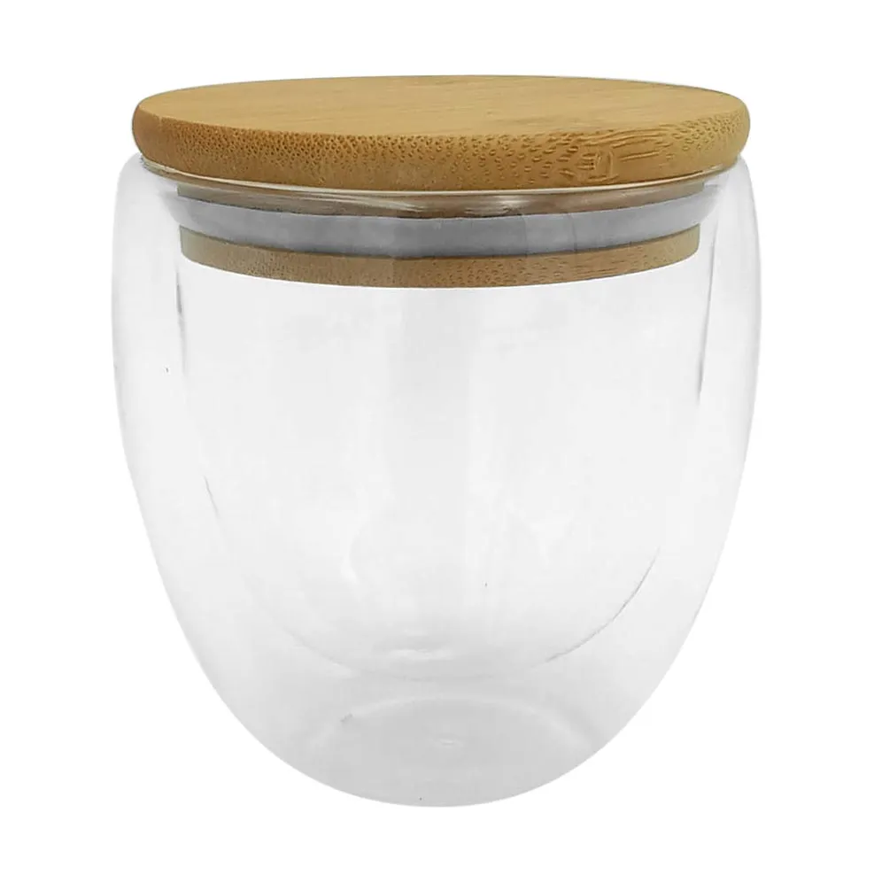 Ø 9 x 9,5 cm. medida de la taza y Ø 9 medida de la tapa de bambú. Capacidad 250ml. Vidrio y Bambú. Taza de doble vidrio con tapa de bambú que ademas se puede utilizar como posa taza/vaso. No pasa el calor. Apto para lavavajillas (únicamente la taza) . Presentación en caja de regalo Kraft.