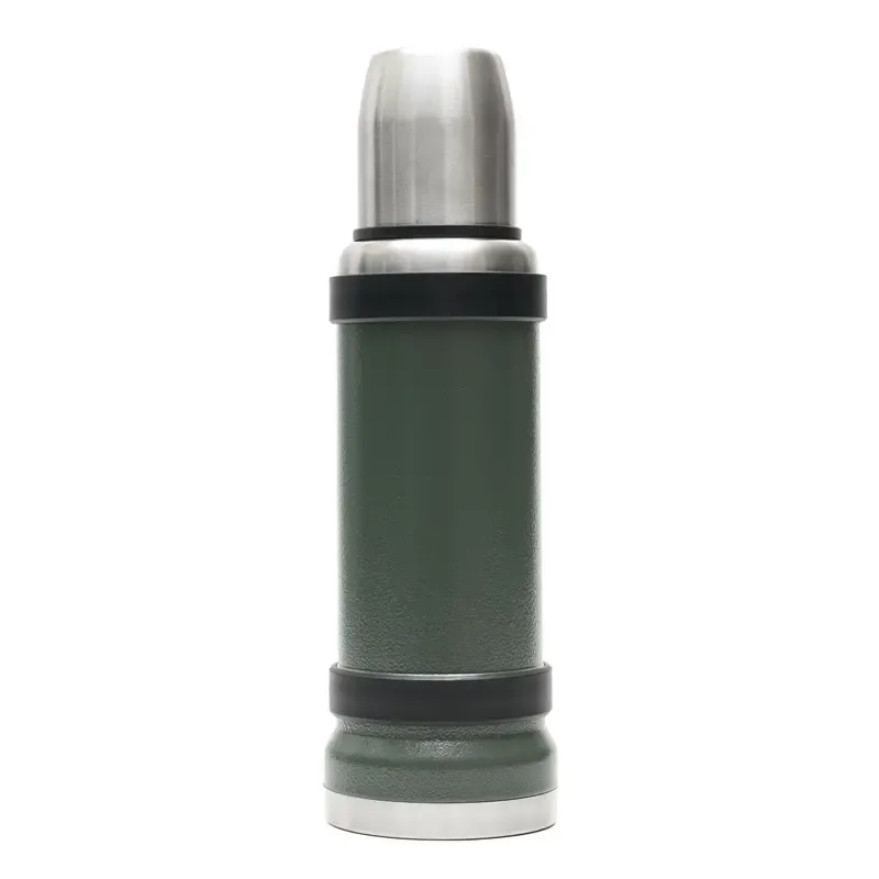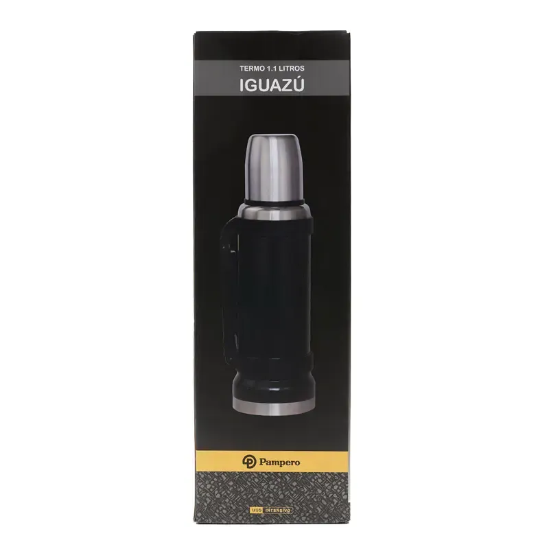 Termo de acero inoxidable 304, recubierto con esmalte especial que protege de ralladuras y golpes. Puede mantener el contenido a la misma temperatura durante 18hs, gracias a su doble pared aislante especial de acero. Cuenta con un tapón cebador Hermético a rosca con la función anti derrame y tapa con superficie plana estable para usar como taza o vaso y manija plegable para facilitar el transporte. Presentado en caja de cartón.