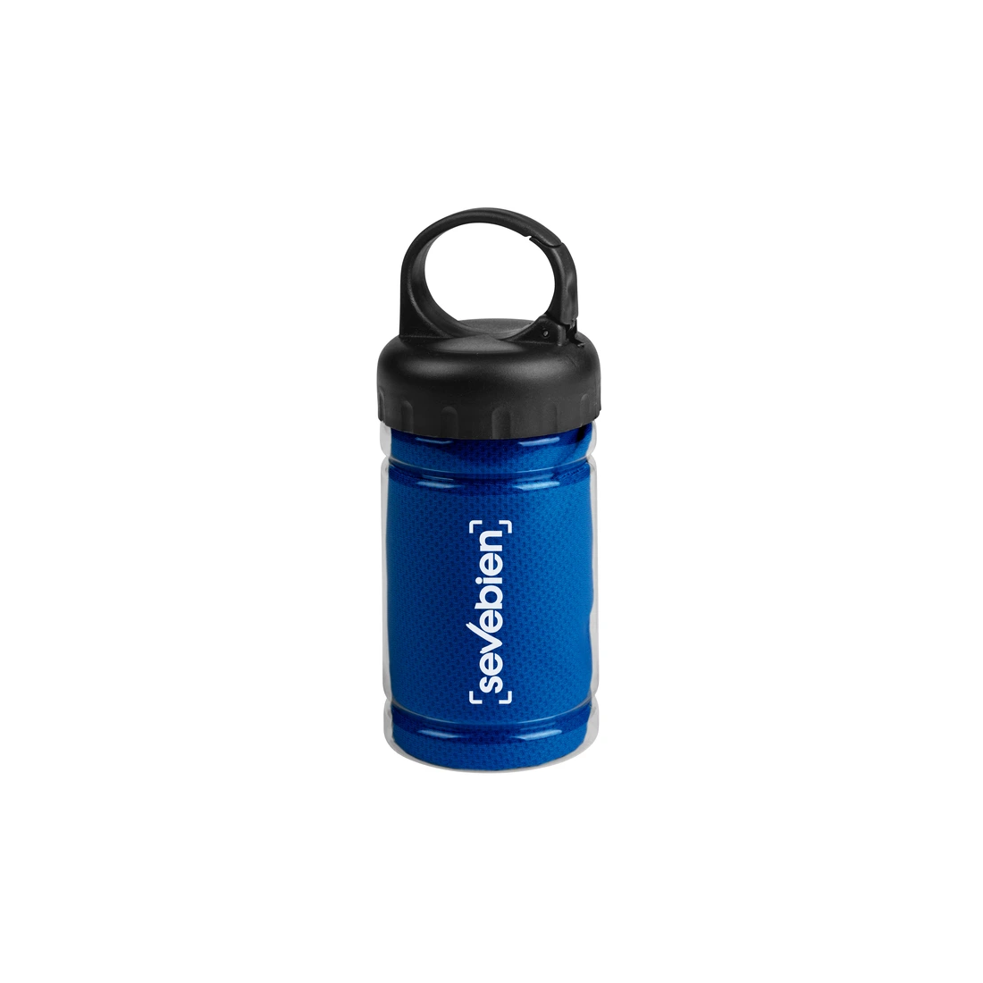 Medidas toalla 79 x 29 cm / Medidas frasco: Ø6,5 x 17 cm. Políester. Toalla de enfriamiento en un estuche de plástico transparente. Para un efecto refrescante humedezca la toalla con agua o agregue agua en el cilindro e incorpore la toalla. Tapa a rosca con mosquetón.