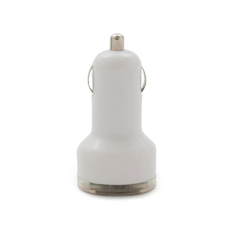 Cargador USB para automóvil en color blanco fabricado en ABS. Entrada de 12-24V y salida de 5V/1,5A. El producto viene en una caja de cartón. Dimensiones: 7,6 x 3,7 x 2,8 cm.